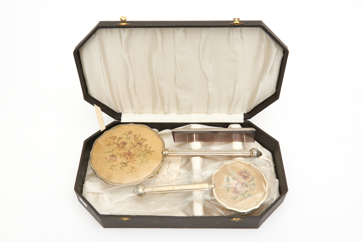 A CASED PETIT-POINT AND EPNS MOUNTED VANITY SET