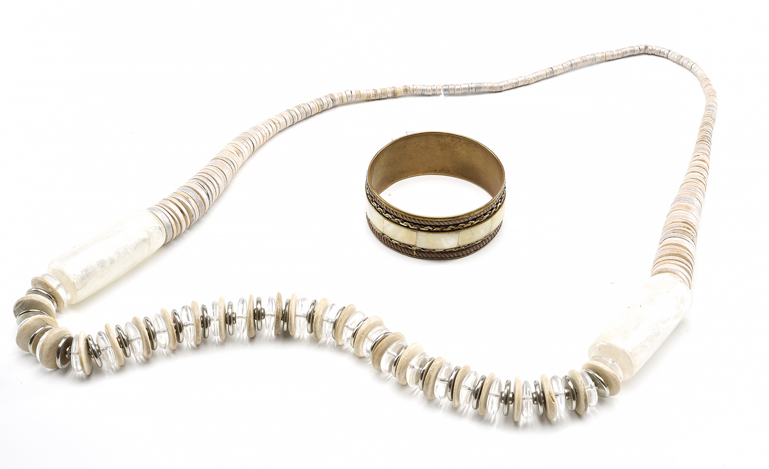A MOTHER OF PEARL AND BRASS BANGLE (INNER DIAMETER 68MM), ALONG WITH A WOOD AND RESIN NECKLACE, TOTAL LENGTH 980MM
