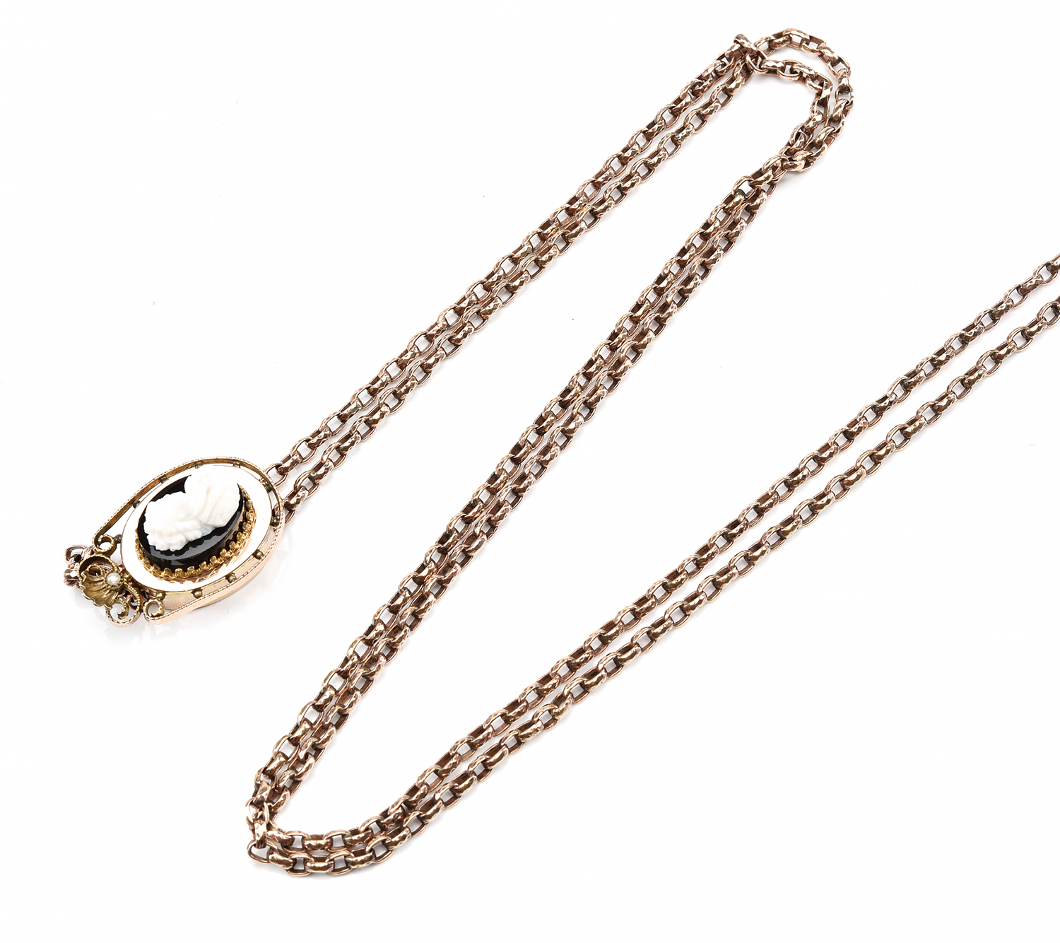 A GOLD LINED GUARD CHAIN WITH CAMEO SLIDE, TOTAL LENGTH 660MM.