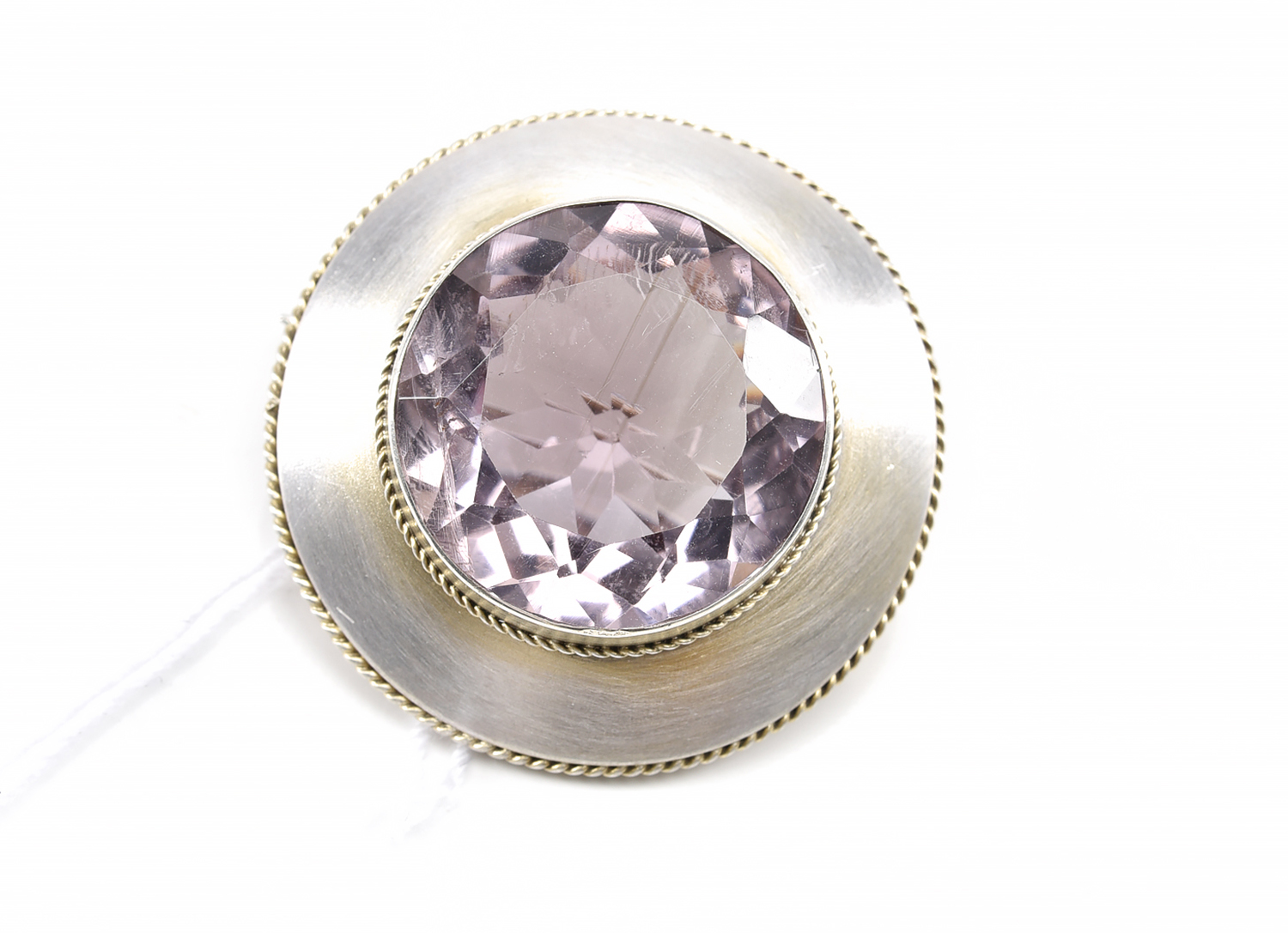 AN AMETHYST BROOCH IN SILVER, AMETHYST DIAMETER 18.98MM.