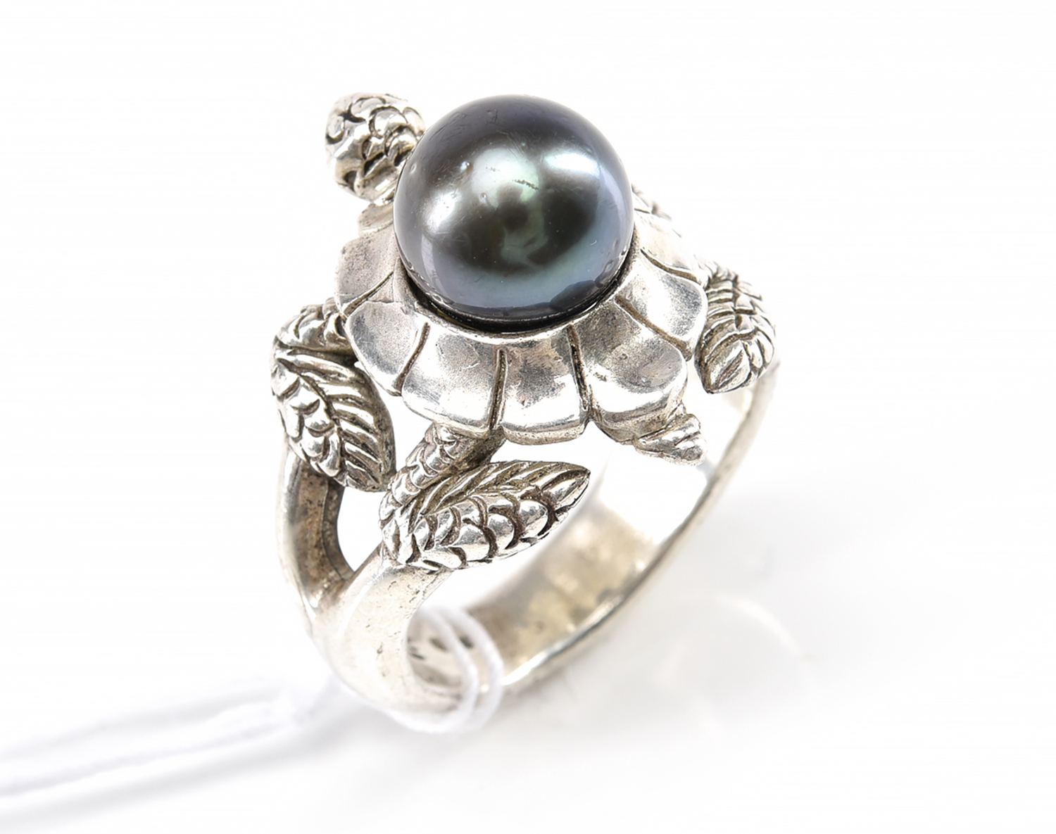 A TAHITIAN PEARL SET "TURTLE" RING IN STERLING SILVER, SIZE O