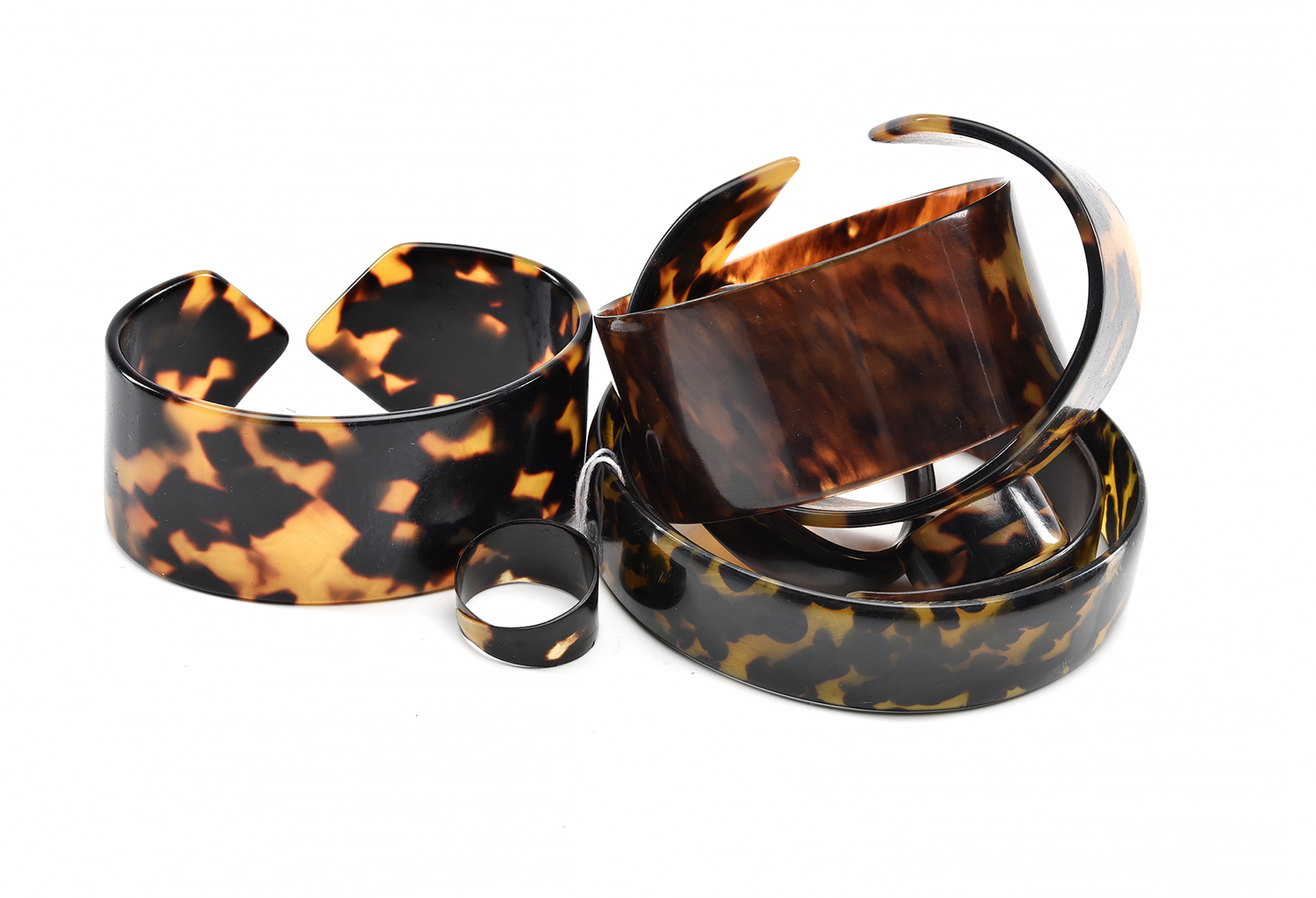 A COLLECTION OF TORTOISESHELL AND CELLULOID BANGLES AND RINGS, SOME A/F