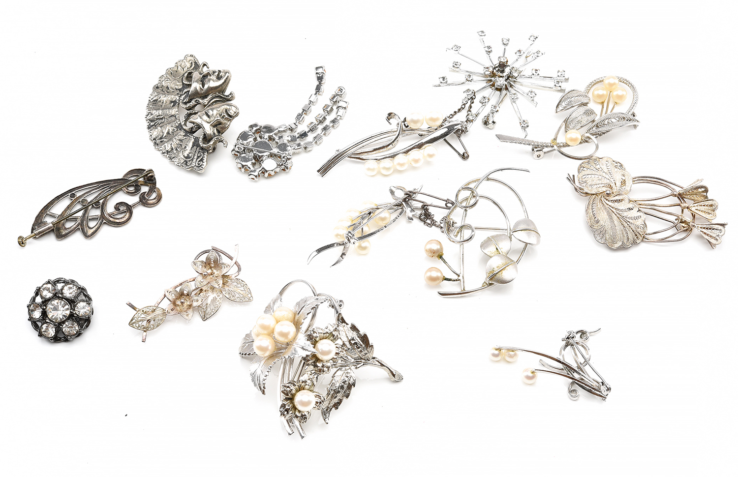 A COLLECTION OF SILVER BROOCHES INCLUDING DIAMANTE AND CULTURED PEARL