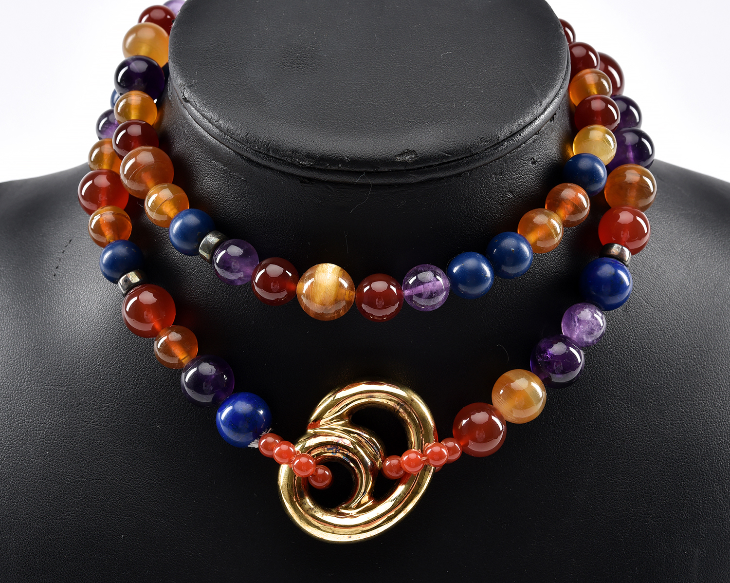 A STRAND OF COLOURED QUARTZ BEADS WITH SILVER GILT PENDANT AND CLASP