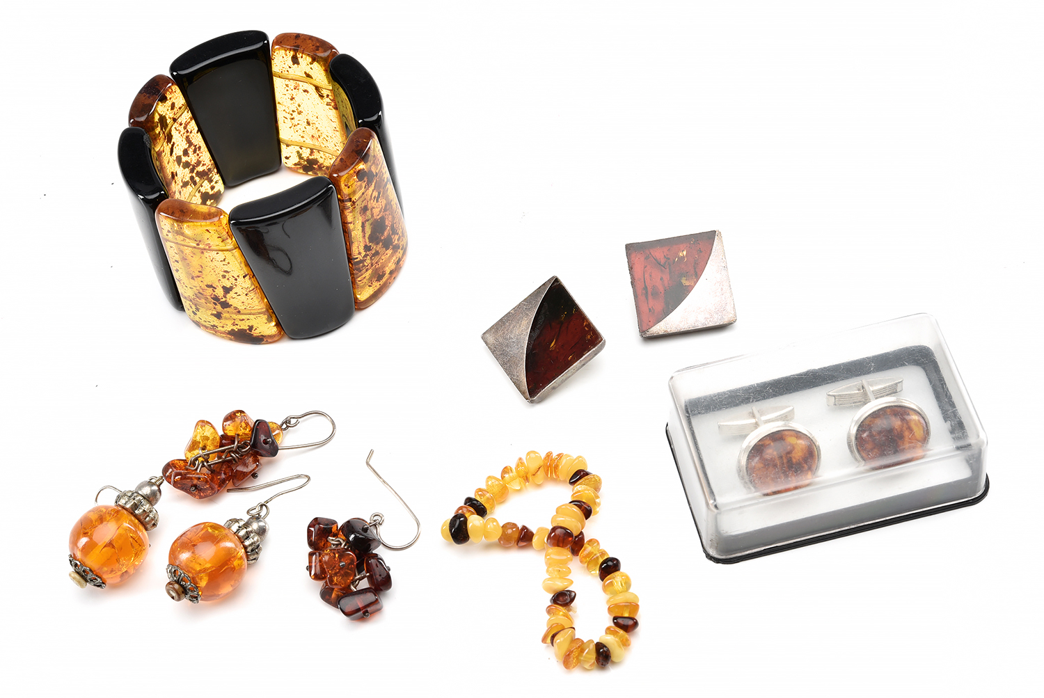 A COLLECTION OF AMBER AND AMBER SIMULANT JEWELLERY INCLUDING EARRINGS AND CUFFLINKS IN STERLING SILVER