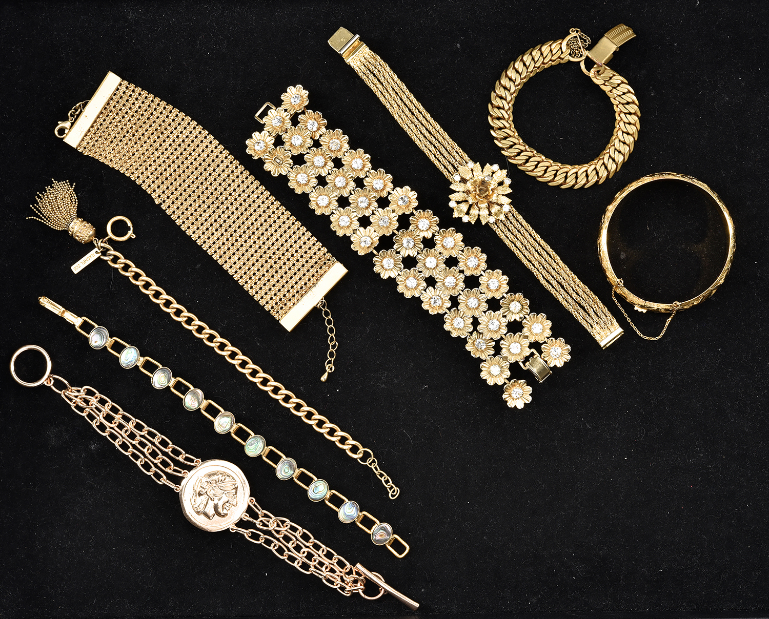 A COLLECTION OF GOLD TONE BRACELETS INCLUDING GLOMESH