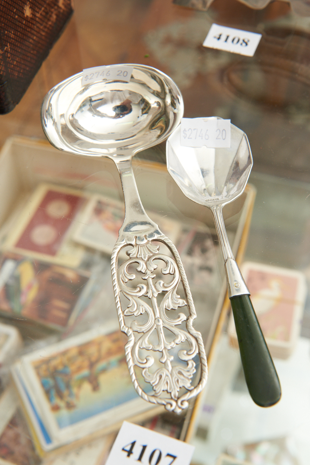 A NORWEGIAN SILVER LADLE WITH A FOLIATE PIERCED HANDLE, TOGETHER WITH A SILVER SPOON WITH A GREEN STONE HANDLE
