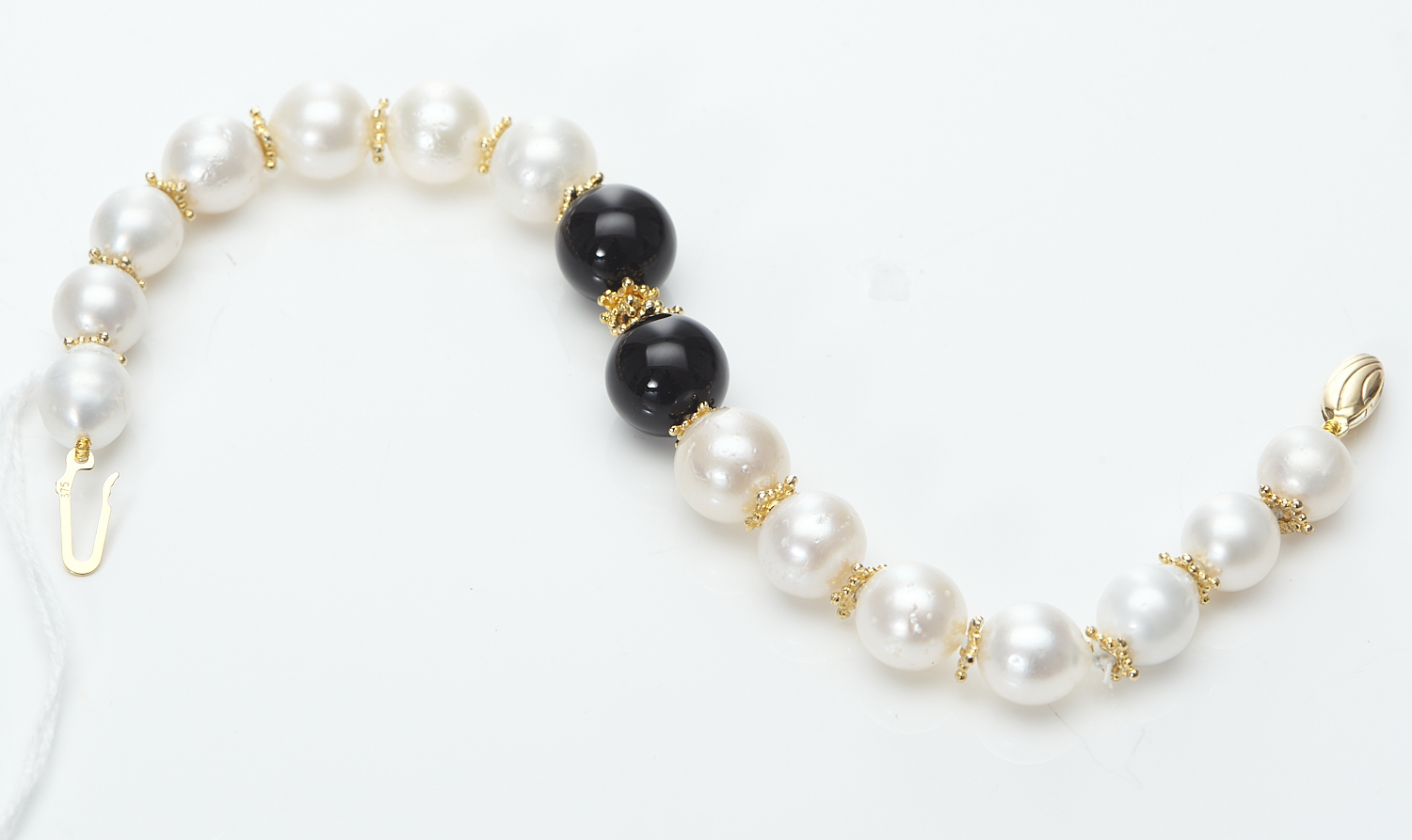 A SOUTH SEA PEARL AND ONYX BRACELET WITH SILVER GILT SPACERS, TO A 9CT GOLD CLASP, LENGTH 210MM