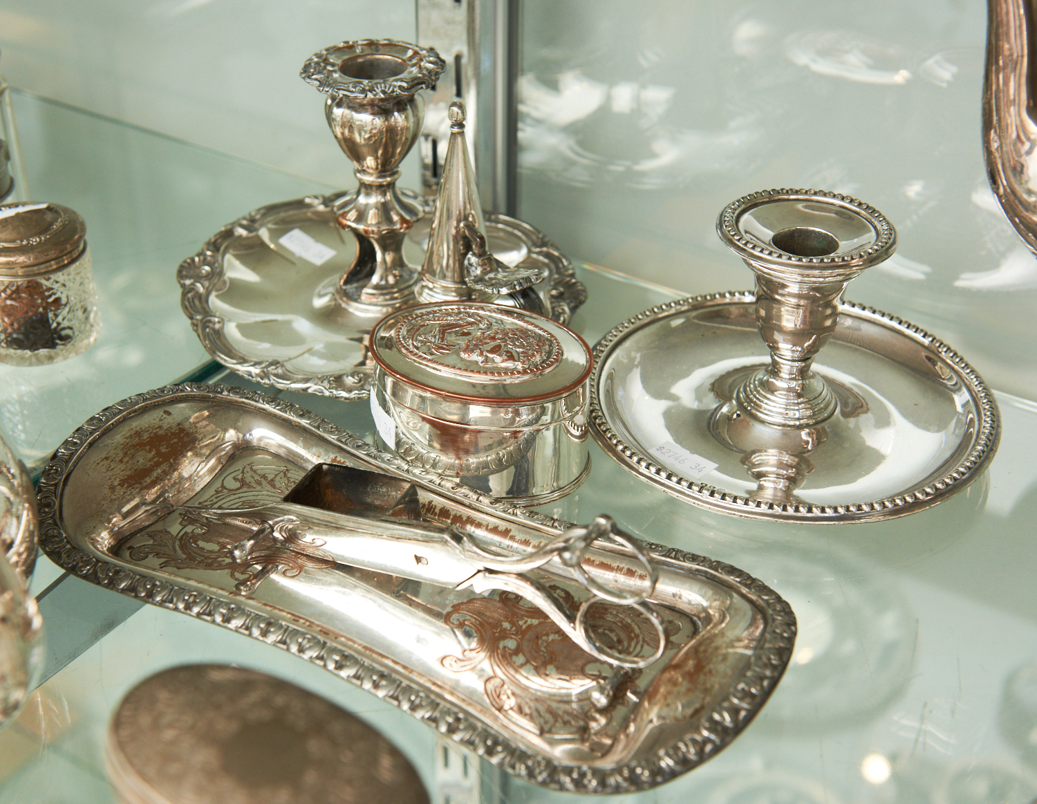 TWO SILVERPLATE CHAMBER STICKS, A CANDLE SNUFFER ON TRAY AND A LIDDED BOX