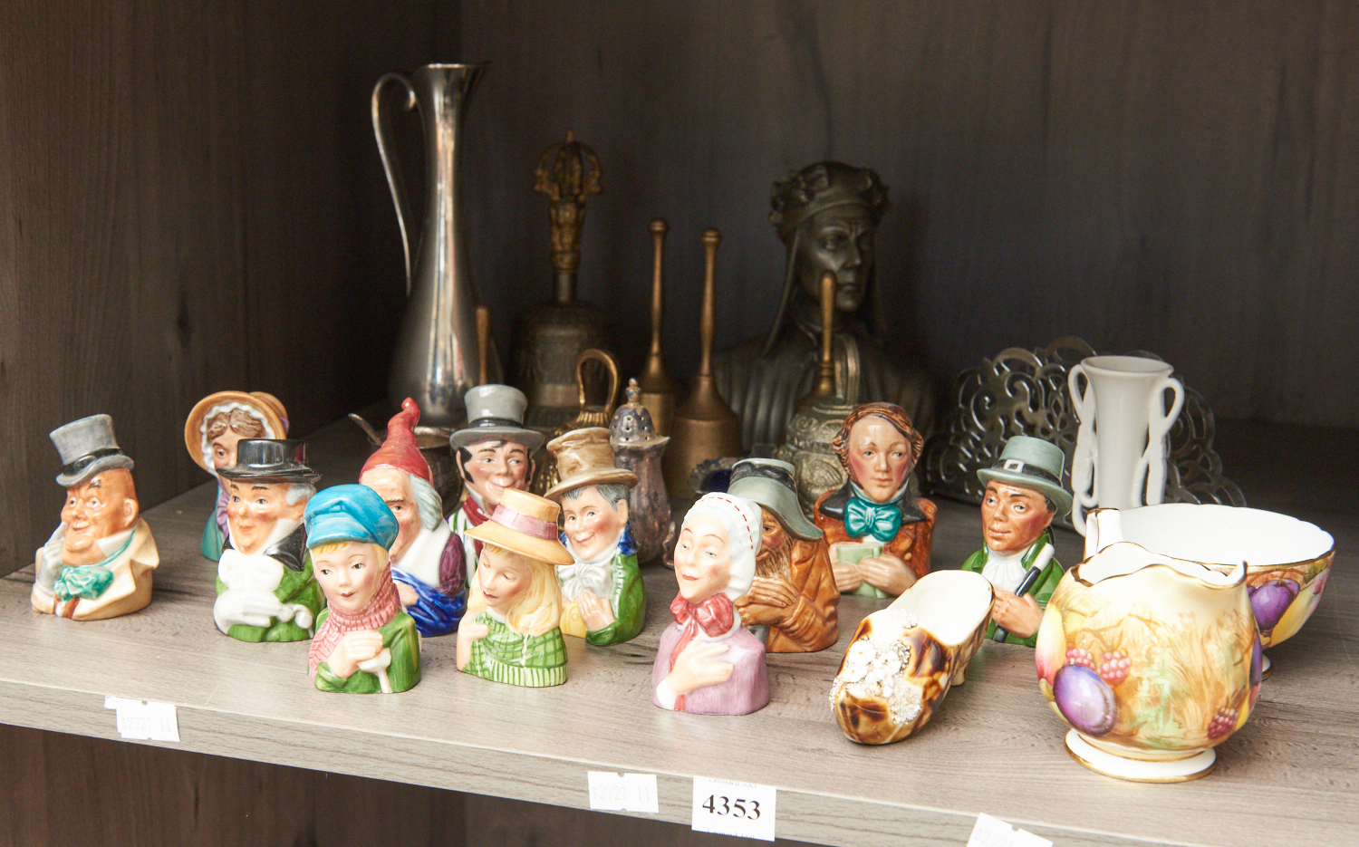 A GROUP OF COLLECTABLE ITEMS, INCLUDING PORCELAIN CHARACTER BUSTS, BRASS AND EPNS