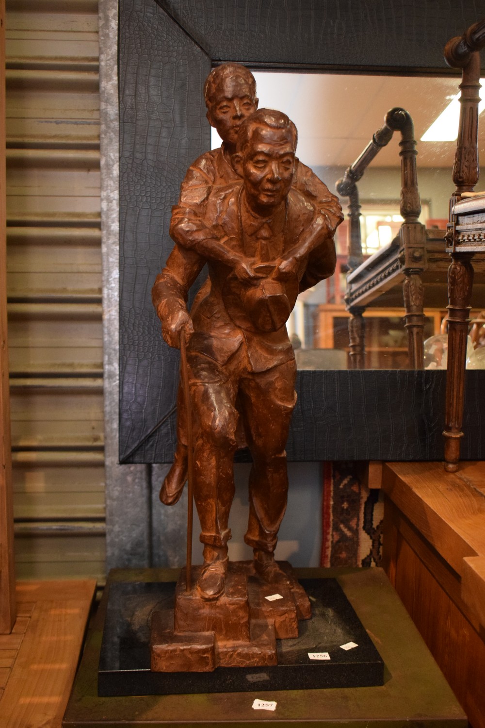 A METAL SCULPTURE OF A MAN CARRYING A BOY (PLEASE NOTE THIS ITEM MUST BE REMOVED BY CLIENTS OR CARRIERS AT THE CUSTOMERS EXPENSE)