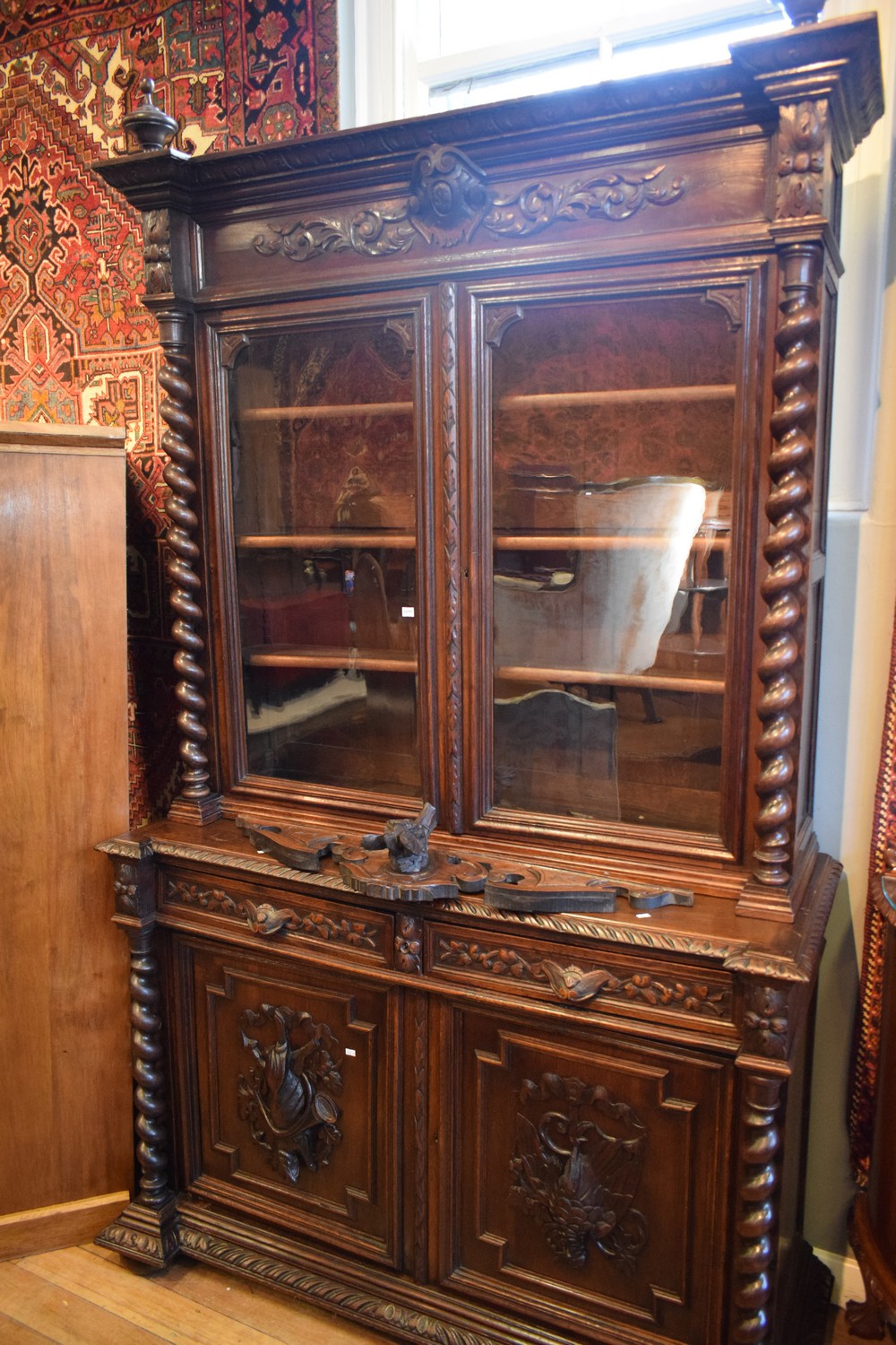 A HEAVILY CARVED SUBSTANTIAL BOOKCASE WITH IN-BUILT DESK ( KEY IN OFFICE ) (A/F) (246H x 140W x 59D CM) (PLEASE NOTE THIS ITEM MUST BE REMOVED BY CLIENTS OR CARRIERS AT THE CUSTOMERS EXPENSE)