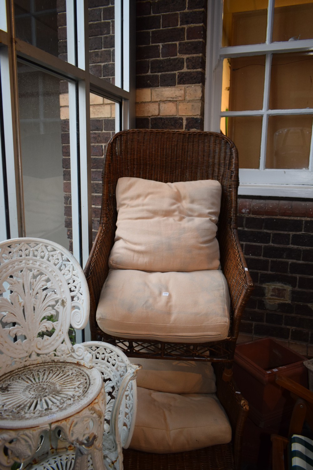 A PAIR OF SUBSTANTIAL CANE CHAIRS WITH CUSHIONS (A/F)
