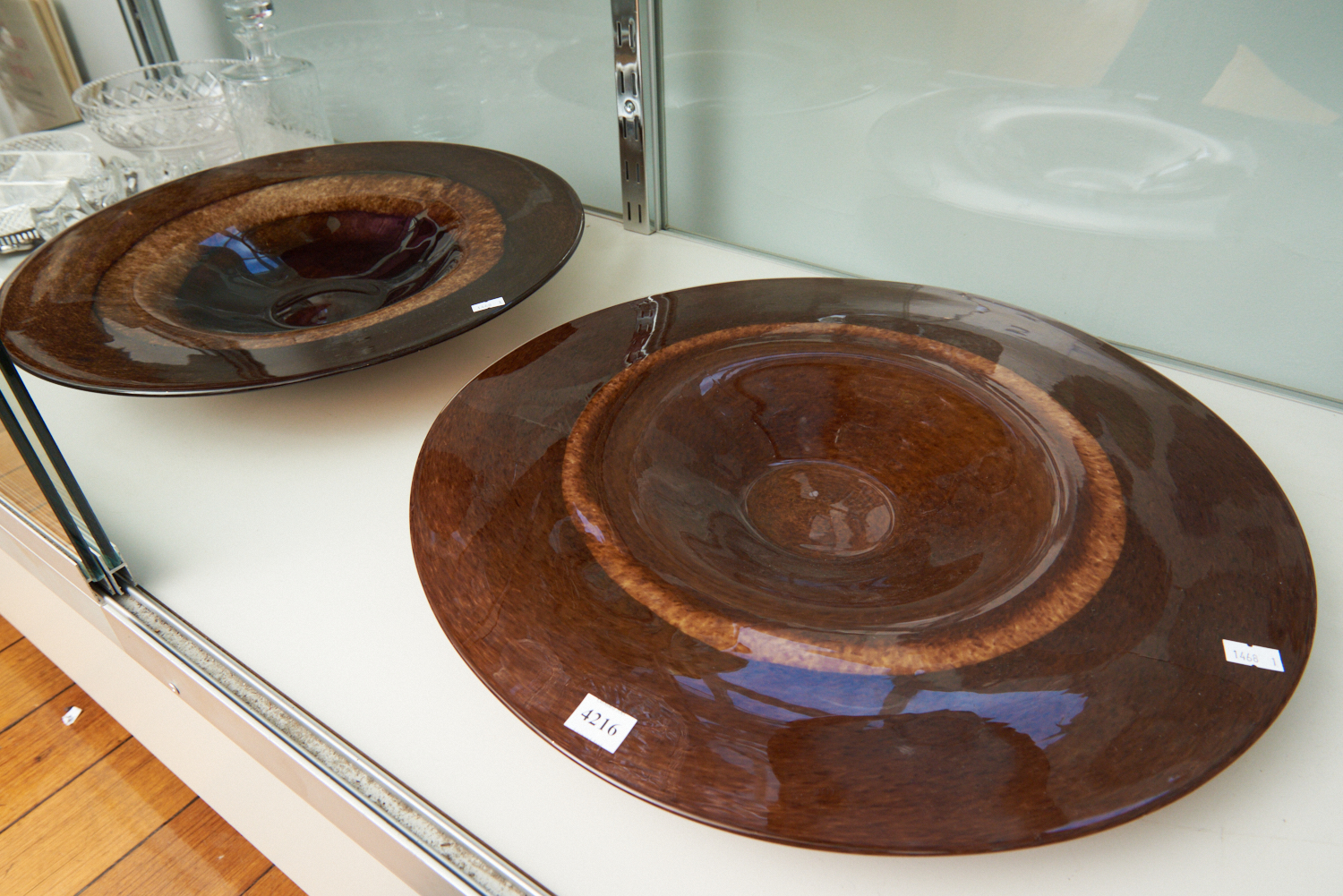 TWO ART GLASS CENTREPIECE BOWLS 47CM DIAMETER