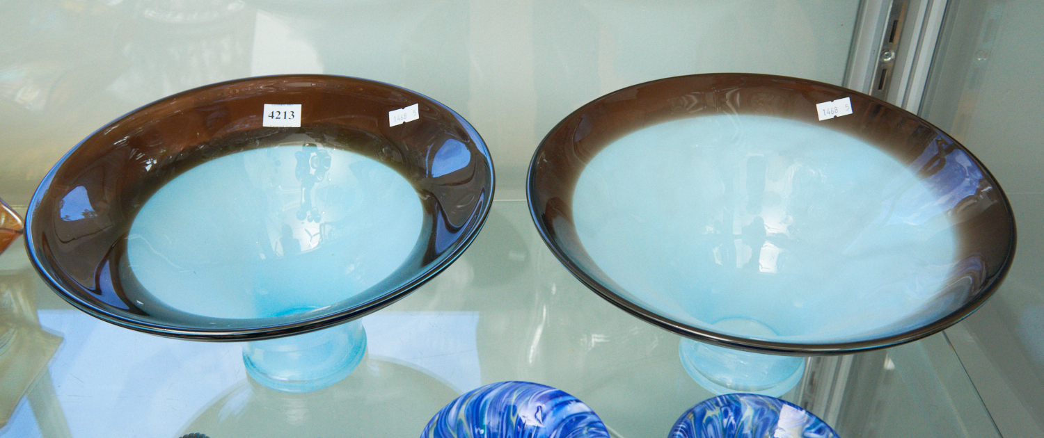 A PAIR OF AQUA AND COLA COLOURED ART GLASS BOWLS DIA 28CM