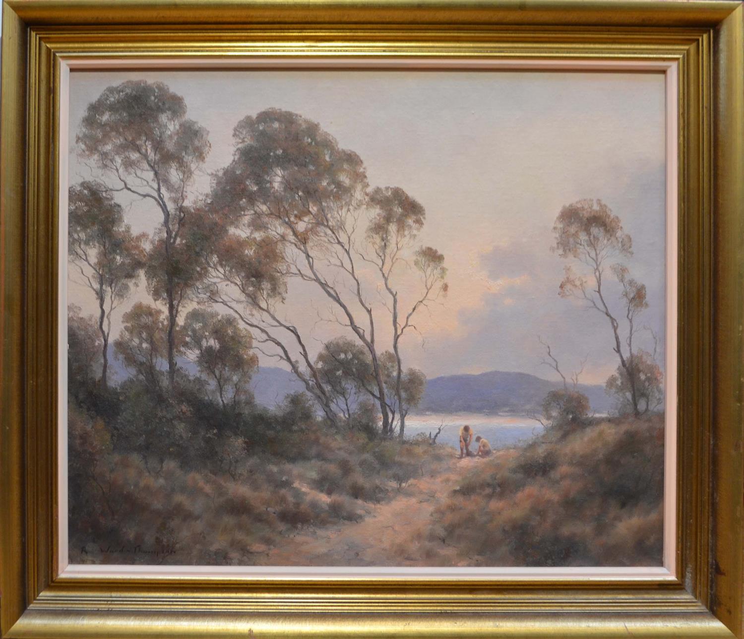 R WARD THOMPSON, FIGURES IN LANDSCAPE, OIL ON BOARD, FRAME SIZE: 62 X 72CM, CONDITION: VERY GOOD