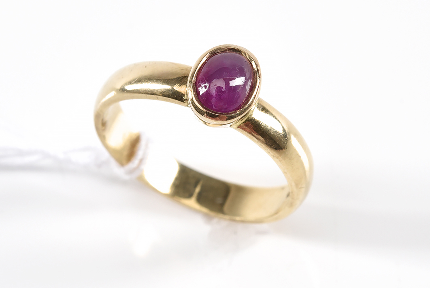 A CABOCHON CUT RUBY RING, IN 9CT GOLD, RING SIZE Q