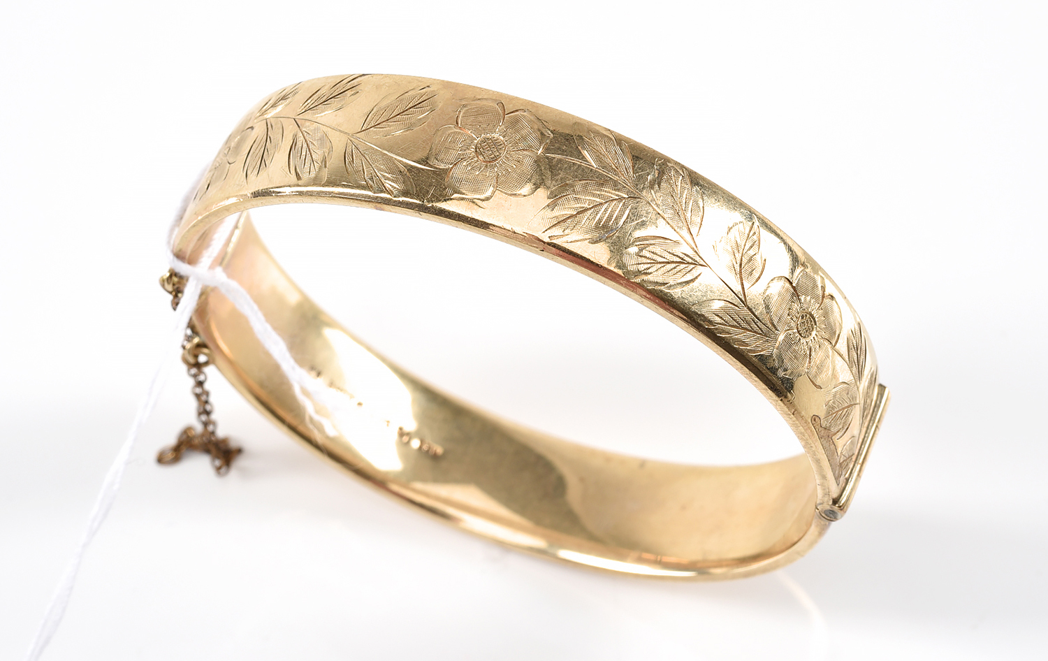AN ENGRAVED HINGED BANGLE IN 9CT GOLD LINING, 59MM DIAMETER