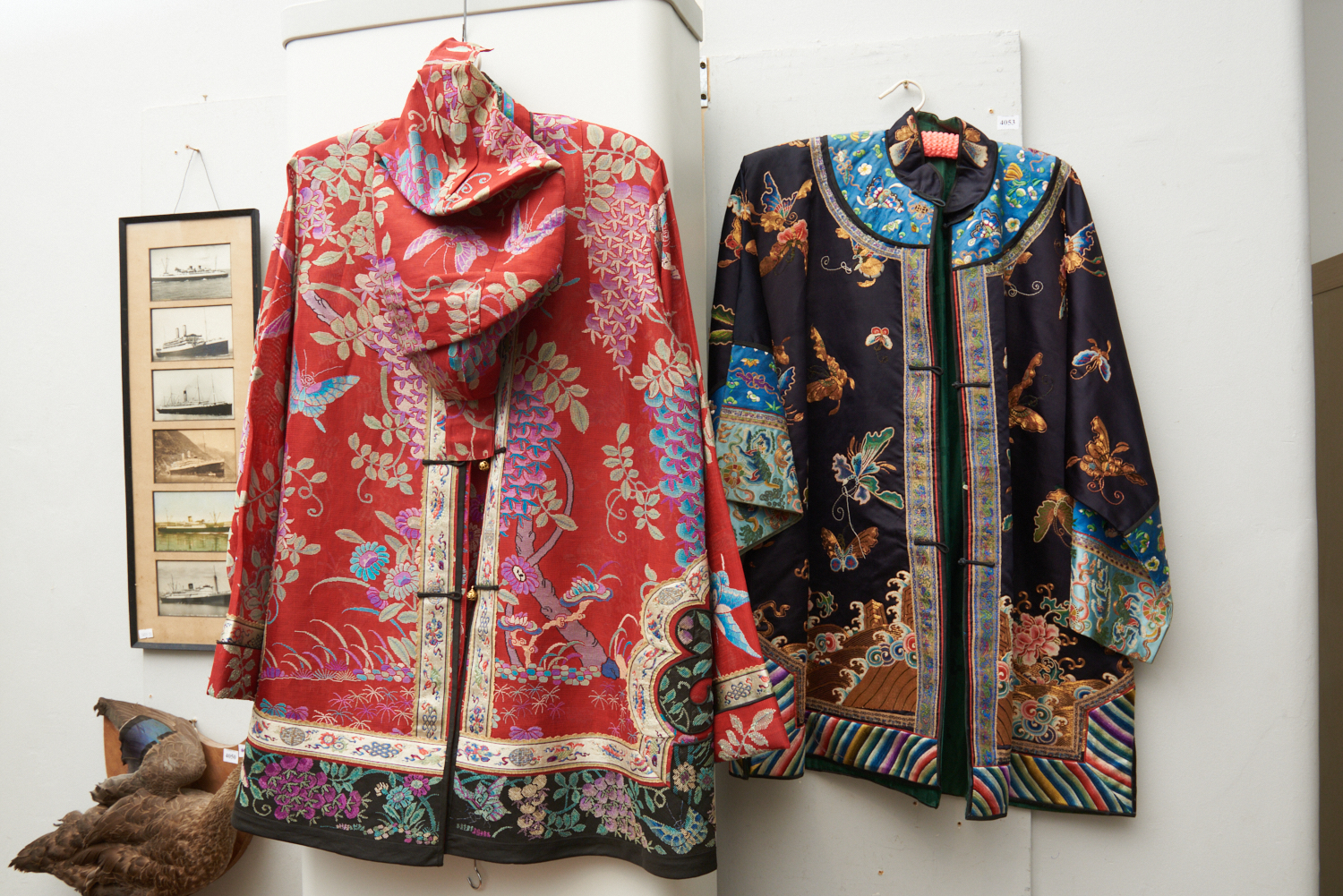 TWO CHINESE EMBROIDERED ROBES, ONE WITH MATCHING PURSE (LOSSES)