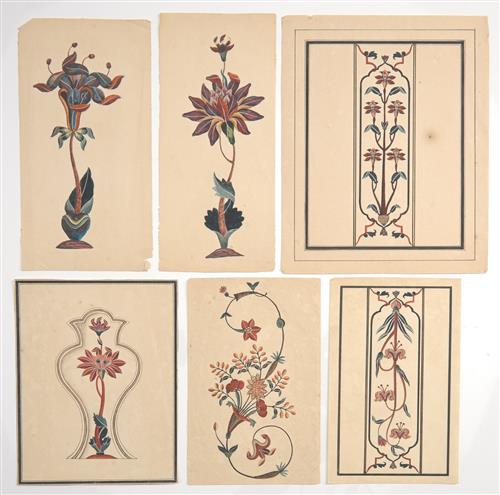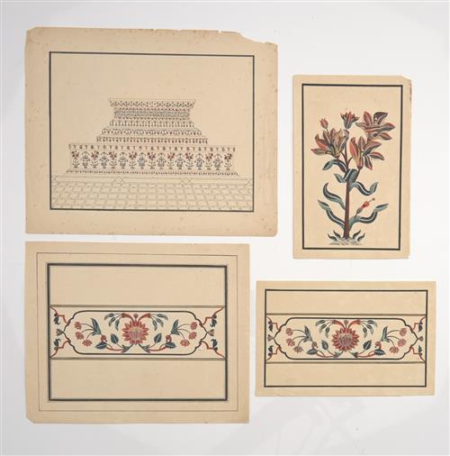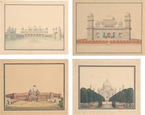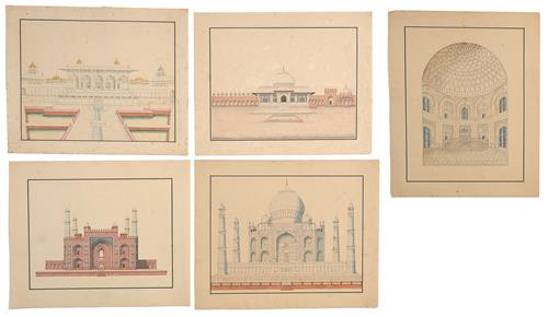 Each very finely painted on European paper (some with watermarks) in gouache and ink, comprising views of Mughal mosques, forts and mausoleums, and detail studies of pietra dura inlays as follows: