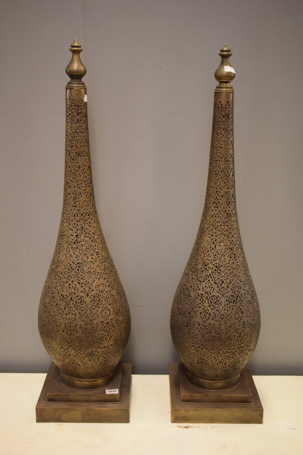 A PAIR OF MOROCCAN INSPIRED PIERCED BRASS LAMPS (A/F IN NEED OF REWIRING) (74H x base-19W x 19D CM)