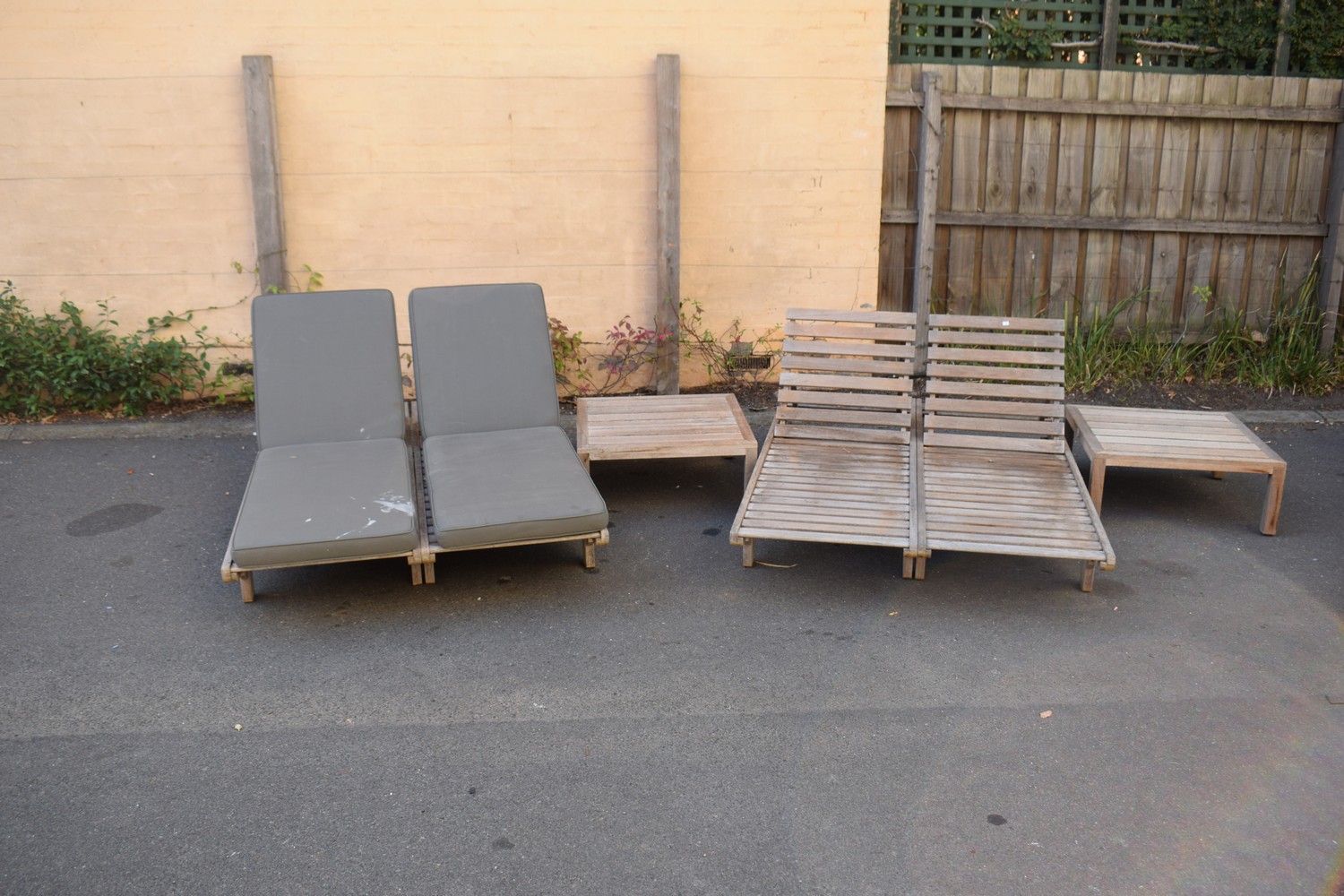 TWO COTSWOLD DOUBLE DAY BEDS, TOGETHER WITH TWO SIDES TABLES. (STAINS TO CUSHIONS. PLEASE NOTE ALL CUSHIONS INCLUDED)