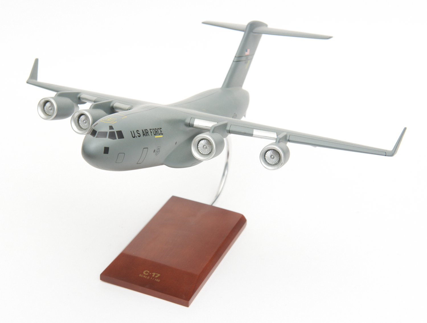A DETAILED STATIC MODEL OF A BOEING C-17 GLOBEMASTER TRANSPORT AIRCRAFT, PAINTED WOOD, 1:100 SCALE, 56 CM LONG, 52 CM WIDE, 28 CM HIGH, WITH BOX
