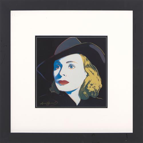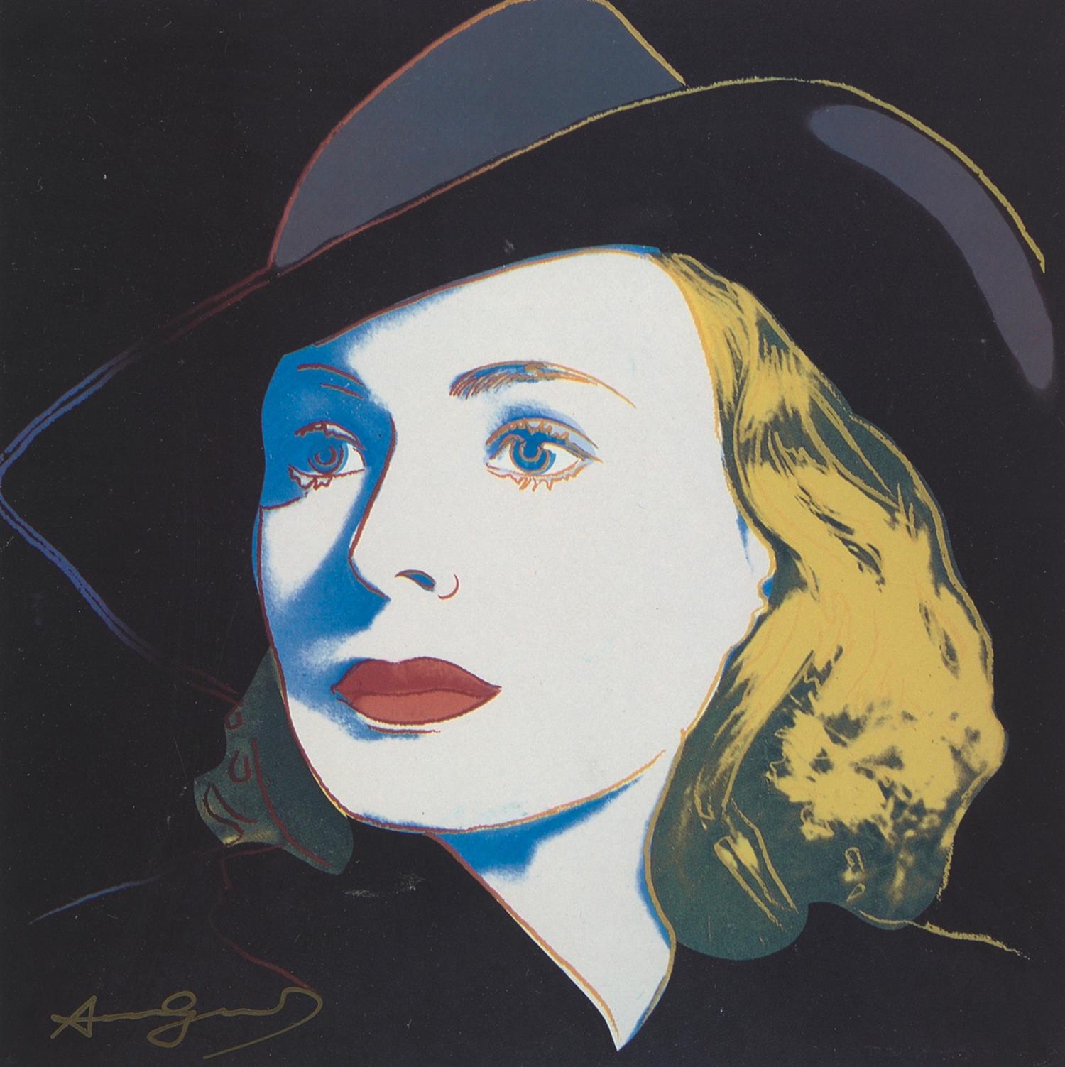 The source images used for these portrait pieces include movie still from her role in the 1942 film Casablanca (With Hat), a movie still from the 1945 film The Bell of St. Mary's (The Nun), and also a publicity photo (Herself). After the success of the Campbell's Soup series in the early 1960s, Warhol began creating screenprints of movie star portraits including Marilyn Monroe, Elvis Presley, and Elizabeth Taylor. This print is indicative of Andy Warhol's obsession with all things relating to fame, especially movie stars.