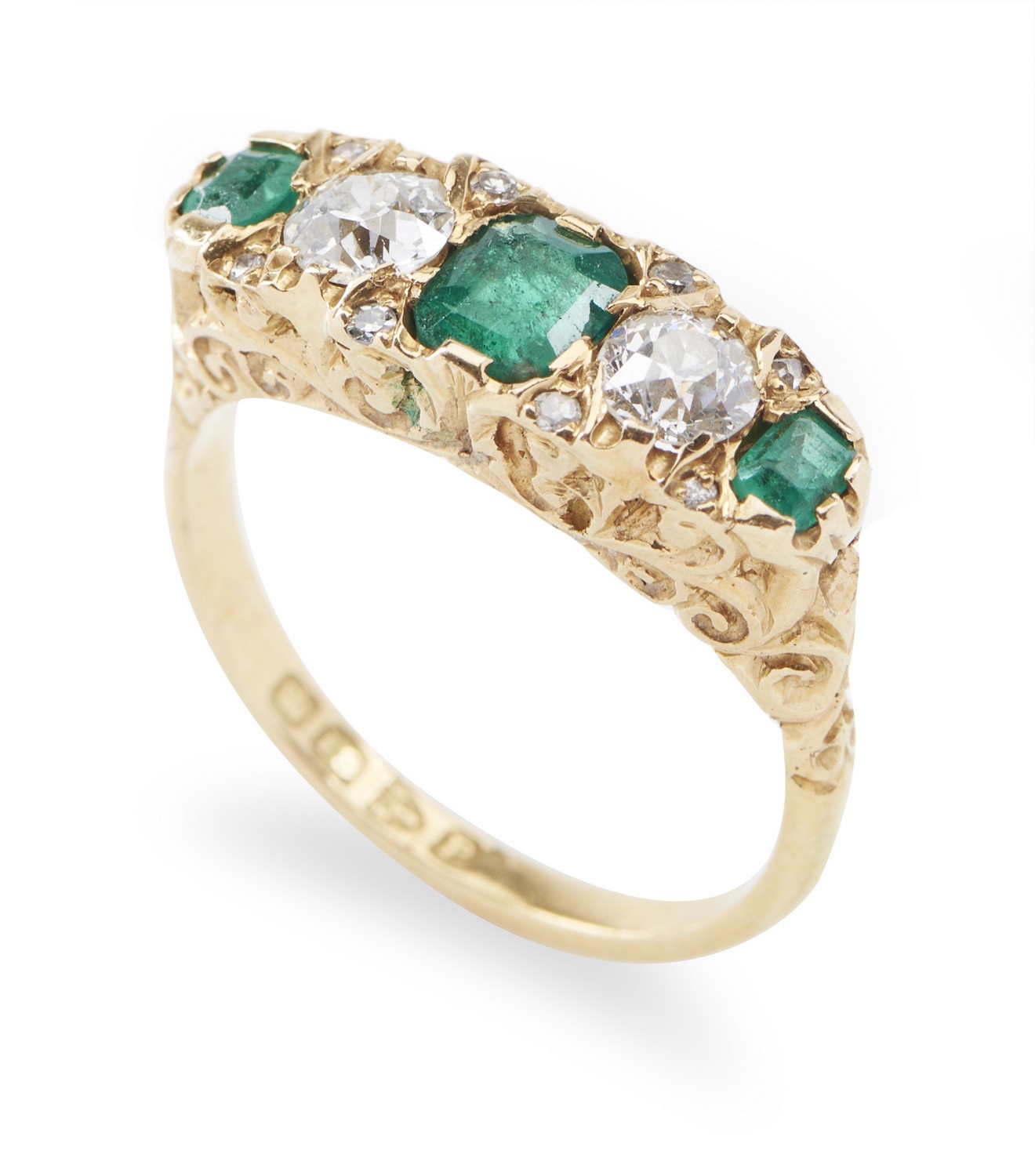 Ring presents in good condition with stones secure in settings. Notable abrasions to the table facets of the emeralds and small chips to the girdle of one of the diamonds. Estimated total weight of emeralds approximately 1.00ct. Estimated total weight of diamonds approximately 0.60ct.