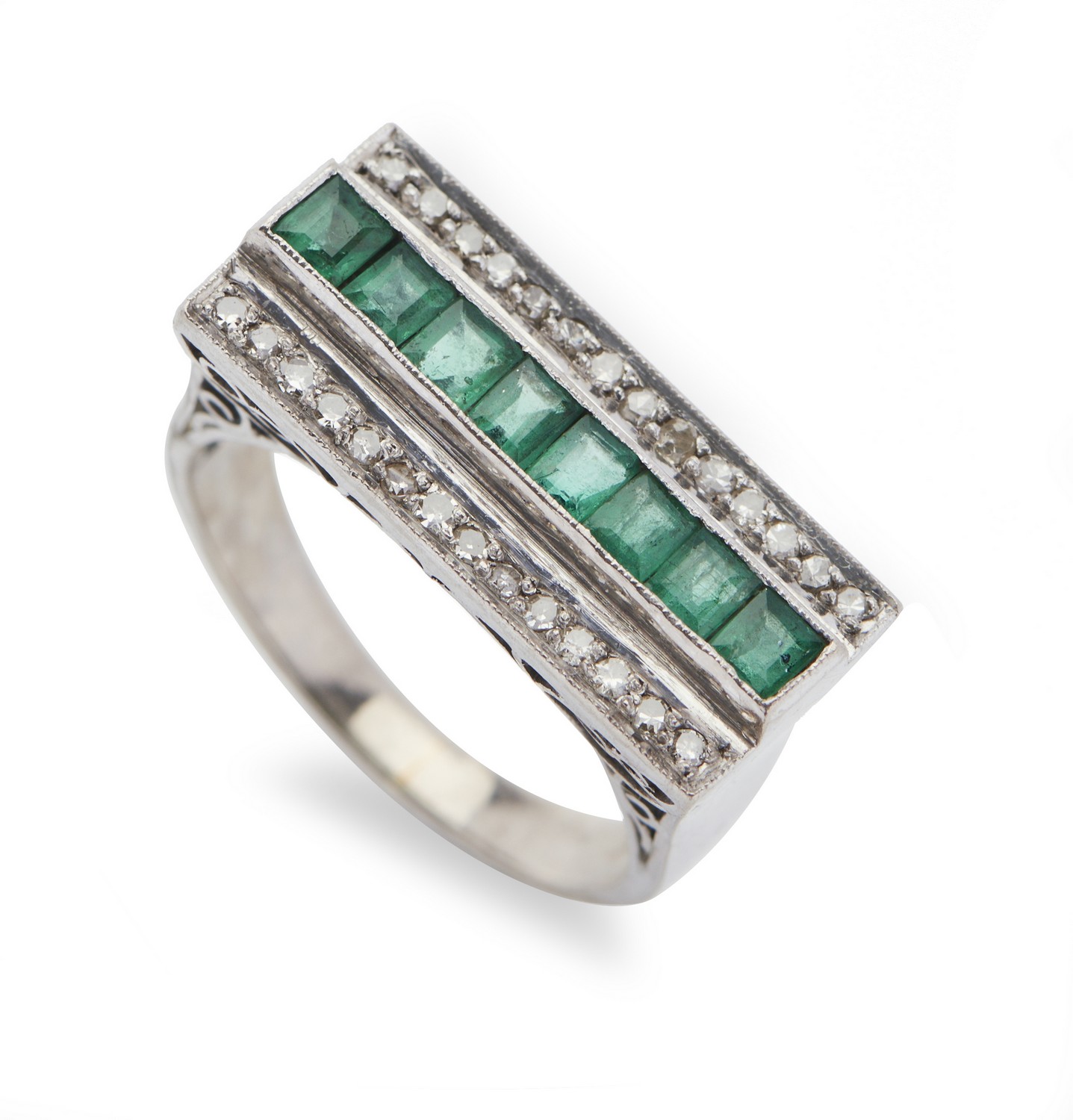 Ring presents in good condition, with some evidence of abrasions to emeralds and chips to some diamonds. Total weight 5 grams.