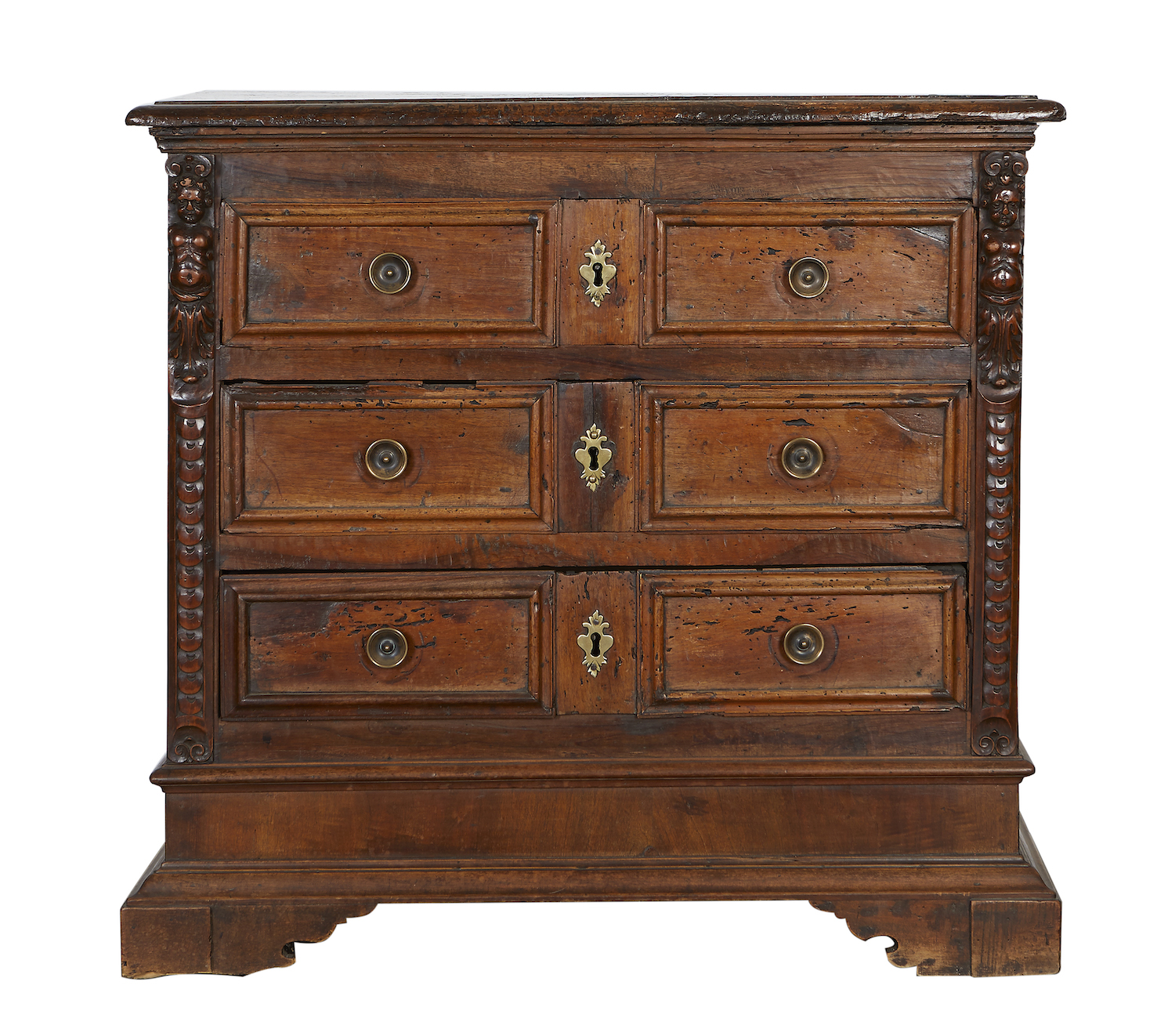 Carved column supports with the typical Renaissance method of pegging throughout, three drawers, original hardware and key, shaped brack feet.