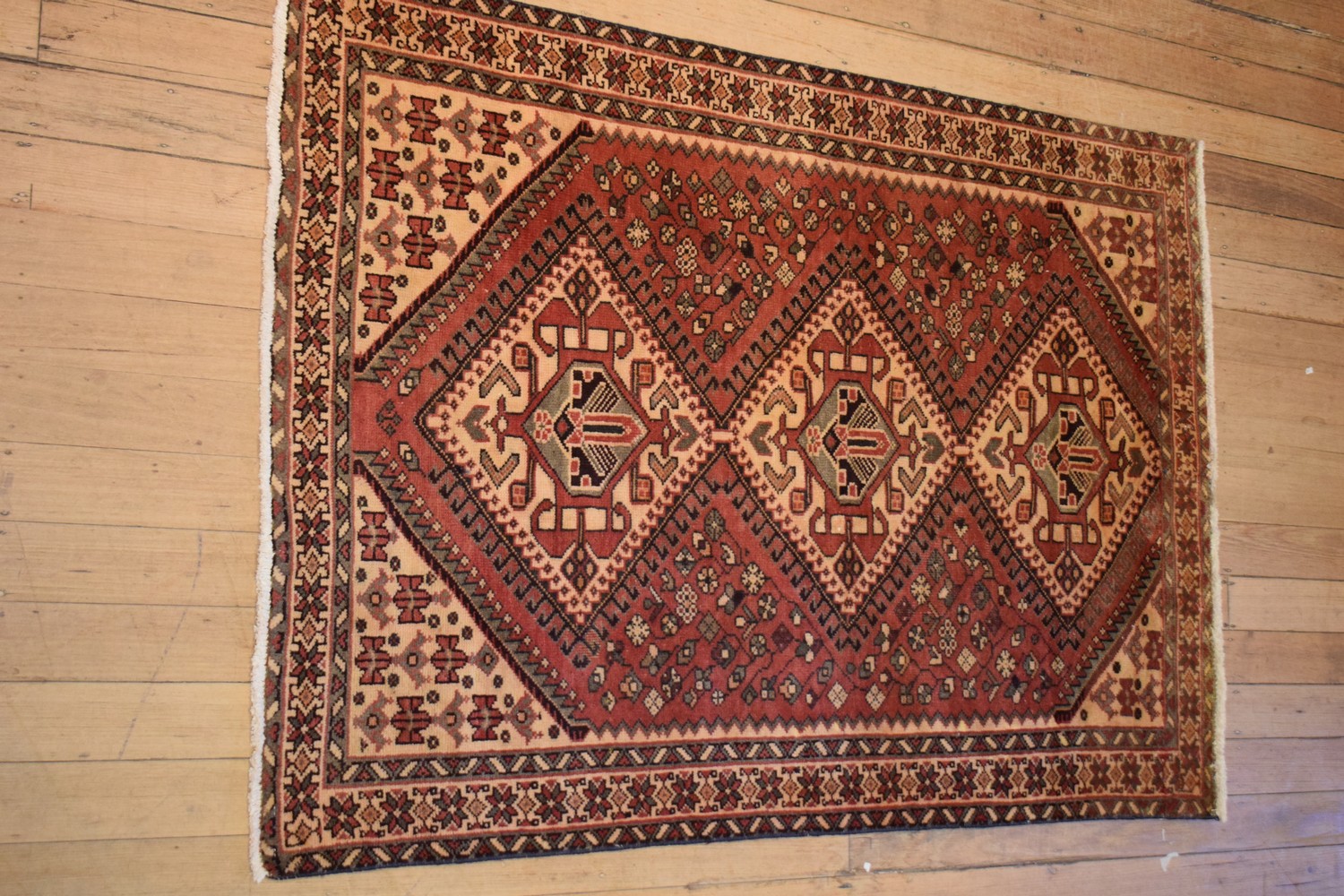 A TRIBAL PERSIAN SHIRAZ RUG. 100% WOOL. HAND-KNOTTED VILLAGE WEAVE WITH TRIBAL DESIGN OF TRIPLE HOOKED MEDALLIONS CONTAINING AMULETS SET WITHIN A RED FIELD OF SECONDARY FLORAL PATTERNS. SIZE: 191X135CM ORIGIN: PERSIA - RRP: $980