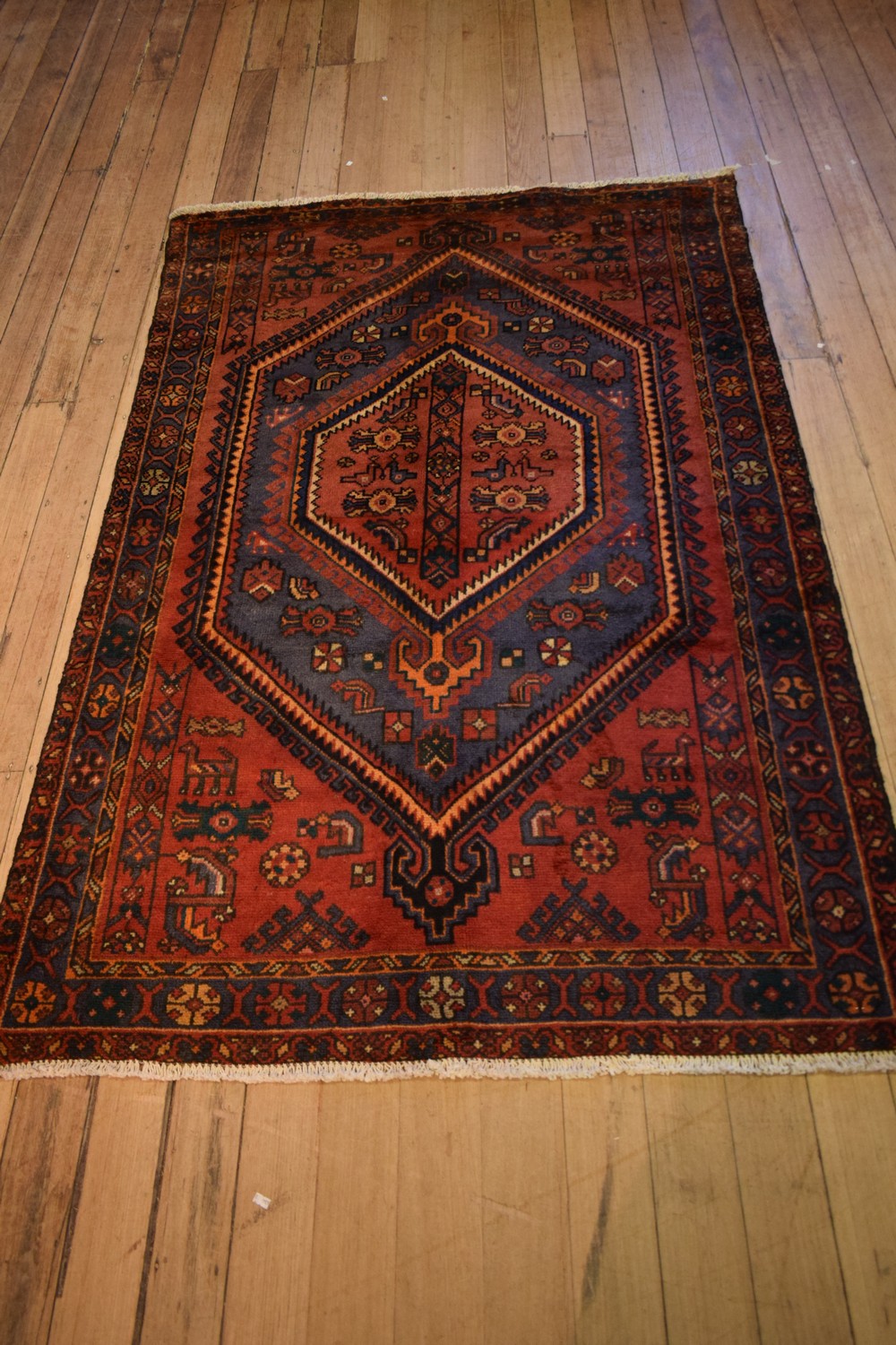 A TRIBAL PERSIAN KHAMSEH RUG. 100% WOOL. DENSE PILE. IN EXCELLENT CONDITION. VILLAGE WEAVE FROM THE HAMADAN REGION WITH TRIBAL DESIGN OF ANCHORED HEXAGONAL MEDALLION CONTAINING FLORAL PATTERNS AND BIRDS IN A SECONDARY FIELD OF FLORAL PATTERNS & BIRD FORMS AND TERTIARY FIELD OF TRIBAL PATTERNS AND ANIMAL FORMS. CERTIFCATE OF AUTHENTICITY INCLUDED. SIZE: 204X138CM ORIGIN: PERSIA - RRP: $1,100
