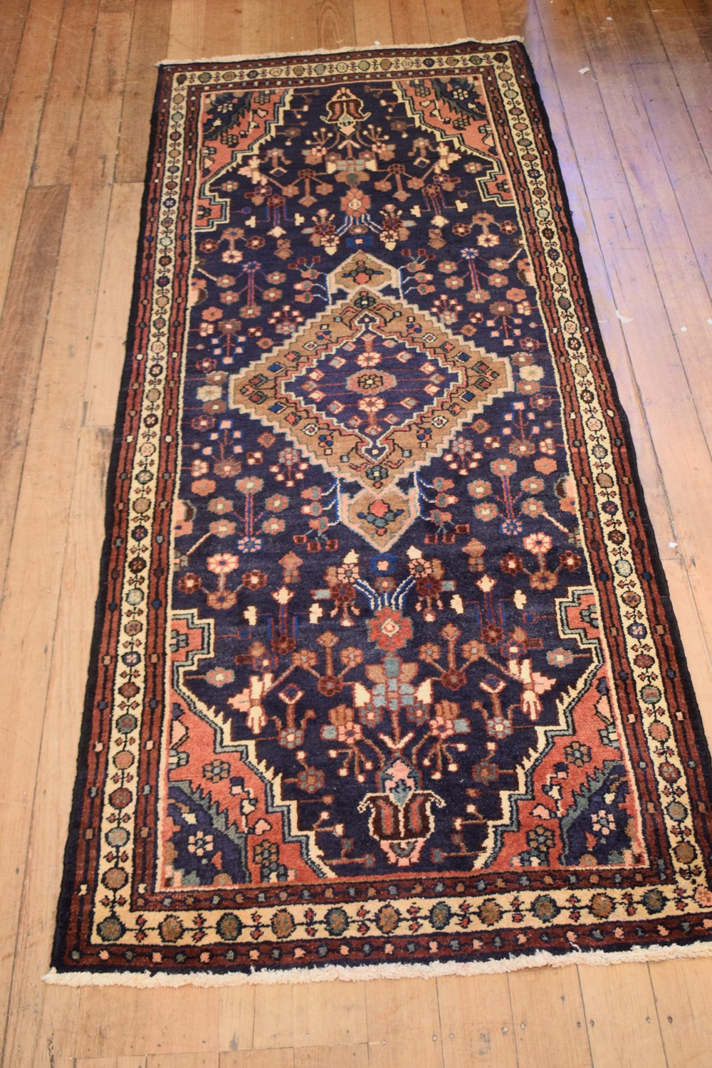 A PERSIAN MEHRABAN HALL RUNNER. 100% WOOL PILE. IN EXCELLENT CONDITION. SOLID & HARD-WEARING. HAND-KNOTTED VILLAGE WEAVE WITH FLORAL DESIGN OF ANGULAR ANCHORED MEDALLION AND CORNER MEDALLIONS IN A BLUE FIELD OF VASES BEARING FLORAL FOLIAGE AND FLORAL SPRAYS. CERTIFCATE OF AUTHENTICITY INCLUDED. SIZE: 280X109CM ORIGIN: PERSIA - RRP: $1,600