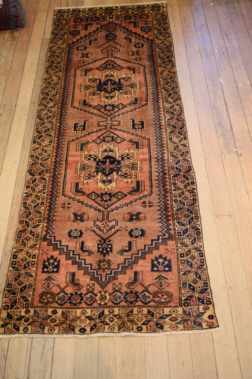 A VINTAGE TRIBAL PERSIAN SHAHSAVAN HALL RUNNER. 100% WOOL. NATURAL DYES. FULLY RESTORED AND IN GOOD CONDITION. HAND-KNOTTED TRIBAL WEAVE WITH DESIGN OF DOUBLE BOLD HEXAGONAL MEDALLIONS COMTAINING STYLIZED HERATI PATTERNS IN A FIELD OF FLORAL PATTERNS AND BIRD FORMS. SOLID & HARD-WEARING. CERTIFCATE OF AUTHENTICITY INCLUDED. SIZE: 302X102CM
