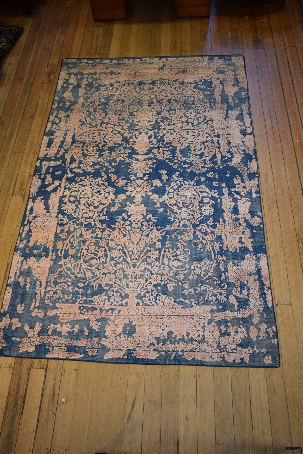 A CONTEMPORARY DESIGNER TRANSITIONAL ERASED OXIDIZED CARPET, WOOL & VISCOSE SILKY TEXTURE. FINELY HAND-KNOTTED & WITH MODERN TRANSITIONAL DESIGN OF ERASED AND EMBOSSED FLORAL PATTERNS IN TONES OF BLUE & ROSE. GALLERY DISPLAYED CARPET. BRAND NEW & IN MAGNIFICENT CONDITION. SIZE: 302X187CM ORIGIN: INDIA - RRP: $5,800