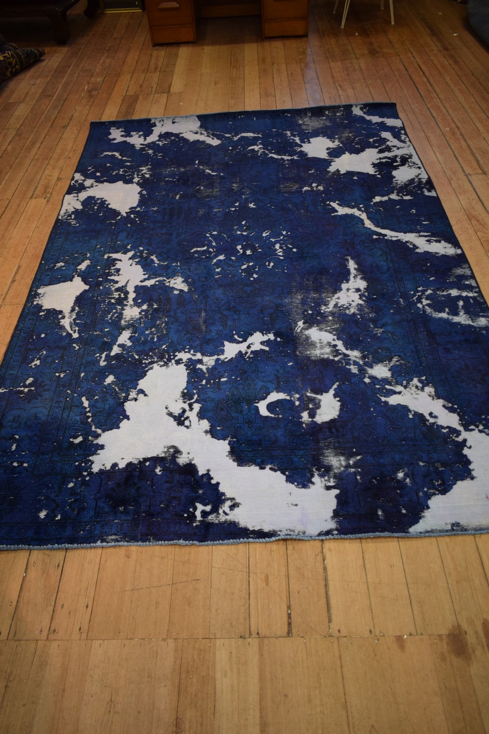 A UNIQUE MODERN VINTAGE OVER-DYED AND HAND-CARVED PERSIAN TABRIZ CARPET. CREATED FROM A HAND-KNOTTED VINTAGE PERSIAN TABRIZ CARPET WITH HAND-CARVED FLORAL PATTERN, OVER-DYED IN TONES OF BLUE & BLACK. CERTIFCATE OF AUTHENTICITY INCLUDED. SIZE: 294X192CM ORIGIN: PERSIA - RRP: $2,200