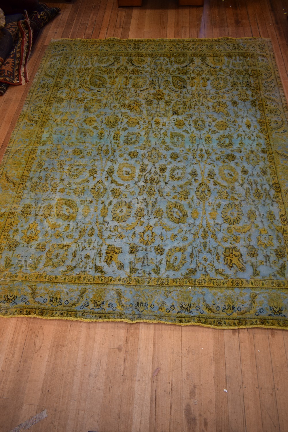 A MODERN OVER-DYED & HAND-CARVED VINTAGE PERSIAN TABRIZ CARPET. EX-GALLERY EXHIBITED. ONE OF A KIND. AN ORIGINAL HAND-KNOTTED PERSIAN TABRIZ CARPET, KNOTTED USING HAND SPUN WOOL ON STRONG COTTON WARPS WITH THE PILE SHORN DOWN. THE RUG IS OVER-DYED IN STUNNING COLOUR-FAST BLUE & SAFFRON DYES AND HAND-CARVED TO CREATE UNIQUE PATTERNS. AS SEEN IN VOGUE & HOME DÉCOR MAGAZINES. CERTIFCATE OF AUTHENTICITY INCLUDED. SIZE: 388X307CM ORIGIN: PERSIA - RRP: $6,300