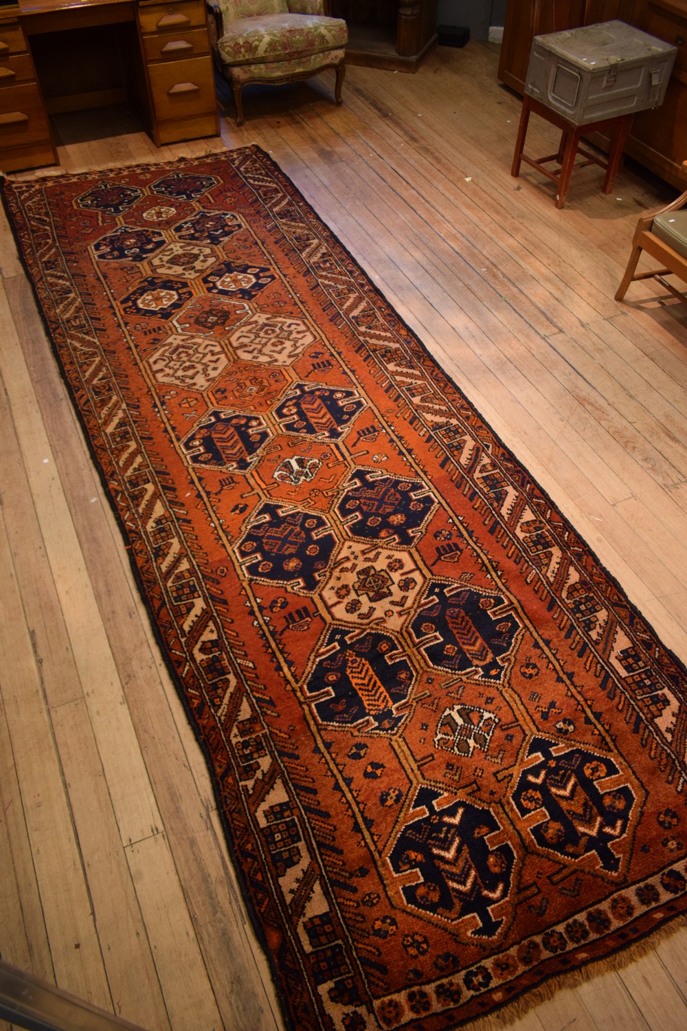 A COLLECTABLE NOMADIC PERSIAN LORESTAN HALL RUNNER. 100% HAND-SPUN WOOLEN WEFT & WARP & NATURAL DYES. EXTRA-WIDE RUNNER. EX-GALLERY STOCK. HAND-KNOTTED NOMADIC WEAVE AND DESIGN OF REPEATING ROWS OF MEDALLIONS CONTAINING TRIBAL AMULETS SET WITHIN A RED-TONED FIELD OF FLORAL PATTERNS AND ANIMAL FORMS. CERTIFCATE OF AUTHENTICITY INCLUDED. SIZE: 430X147CM - ORIGIN: PERSIA - RRP: $4,800