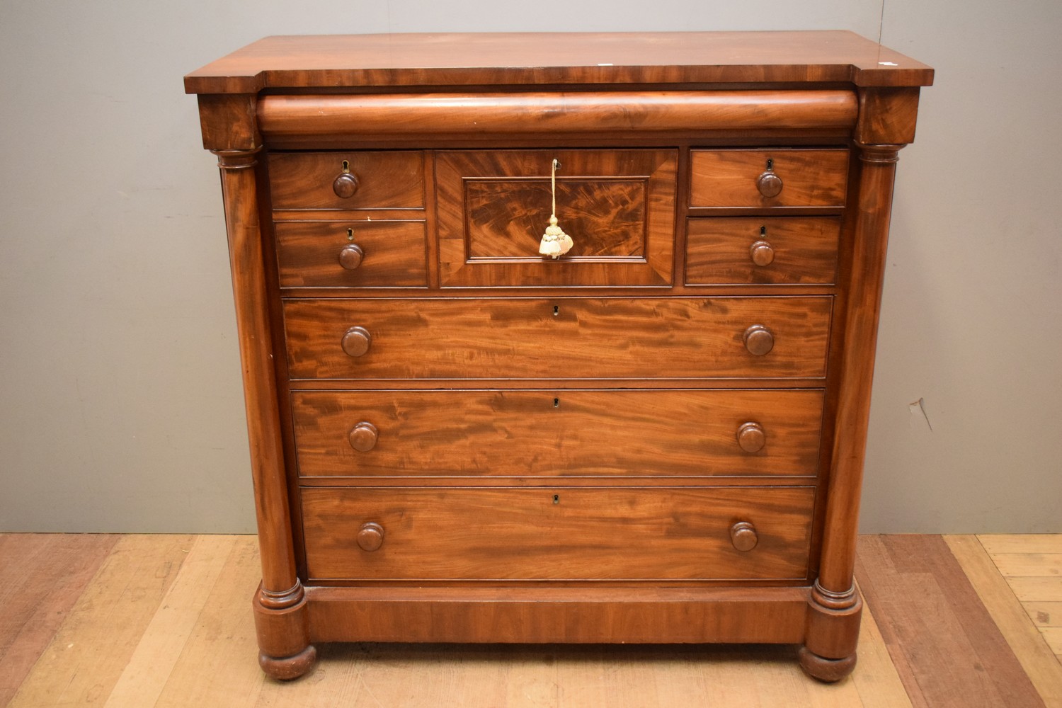 A VICTORIAN SEVEN DRAWER FLAME MAHOGANY CHEST (A/F TO SURFACE TOP) (131H X 131W X 63D) (KEY IN OFFICE) (PLEASE NOTE THIS ITEM MUST BE REMOVED BY CLIENTS OR CARRIERS AT THE CUSTOMERS EXPENSE)