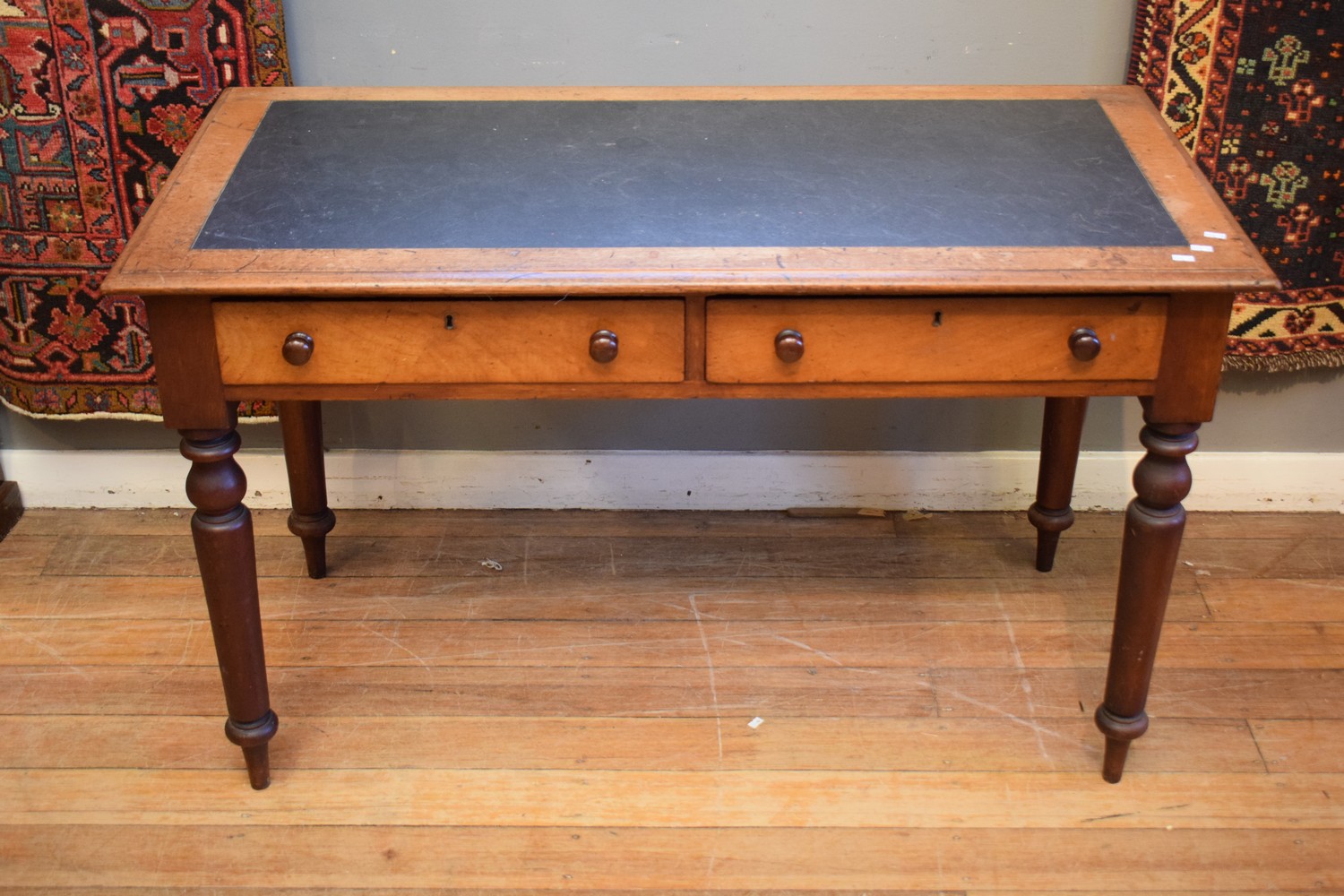 A VICTORIAN CEDAR TWO DRAWER DESK WITH LEATHER INSERT (76H X 124W X 61D)
