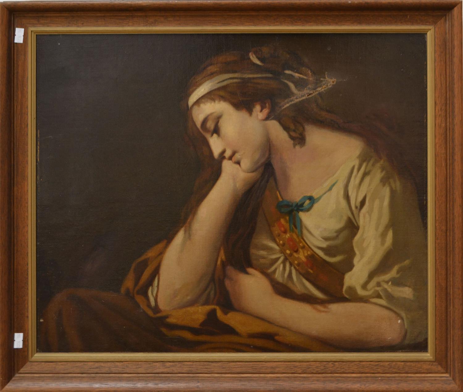 ARTIST UNKNOWN, RESTING WOMAN, OIL ON CANVAS, UNSIGNED, 47.5 X 59CM, FRAME SIZE: 57.5 X 69CM, CONDITION: LARGE TEAR APPROX. 10CM LONG, SOME MINOR LOSSES TO PIGMENT
