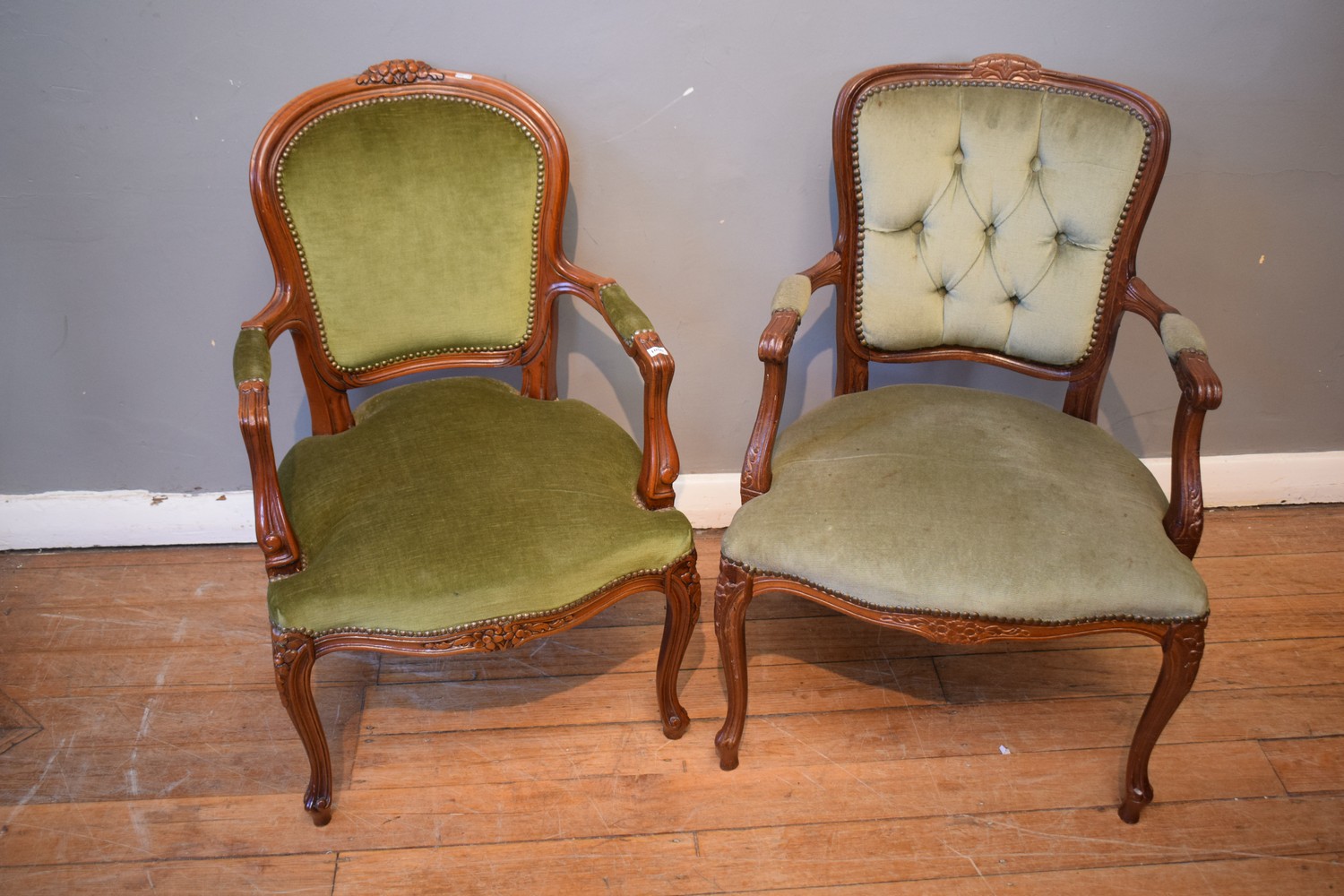 TWO LOUIS STYLE GREEN BERGERES (A/F STAINS)