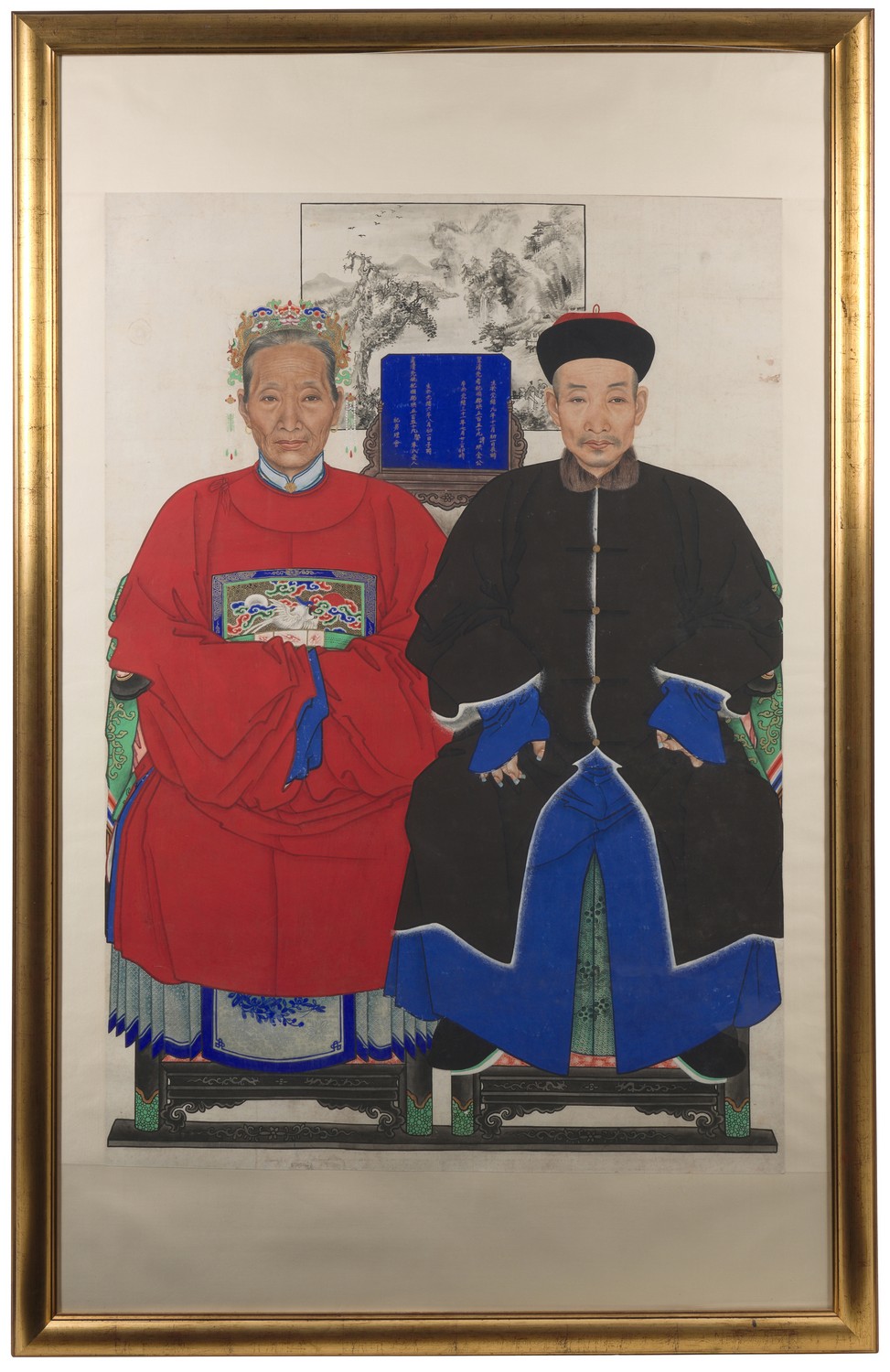Ink, gouache and gilding on paper, depicting a seated official couple dressed in official robes. Mounted in a gilt wood frame with perspex glazing.