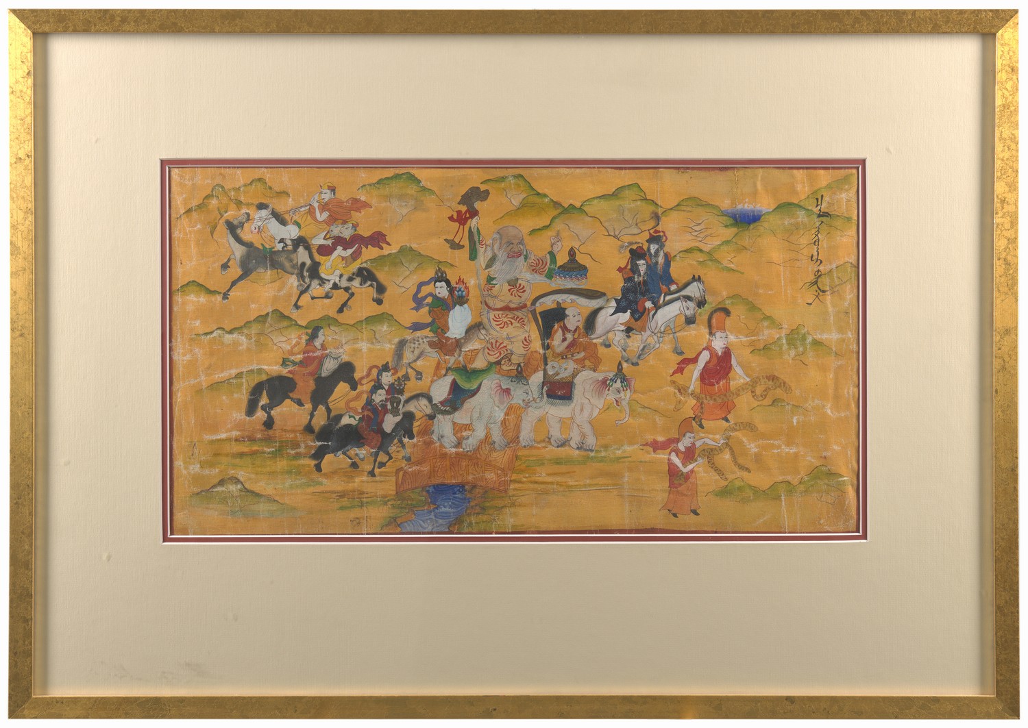 Gouache on paper depicting lamas and Tantric Buddhist deities in a mountainous landscape, with an inscription in Manchurian. Framed and glazed.