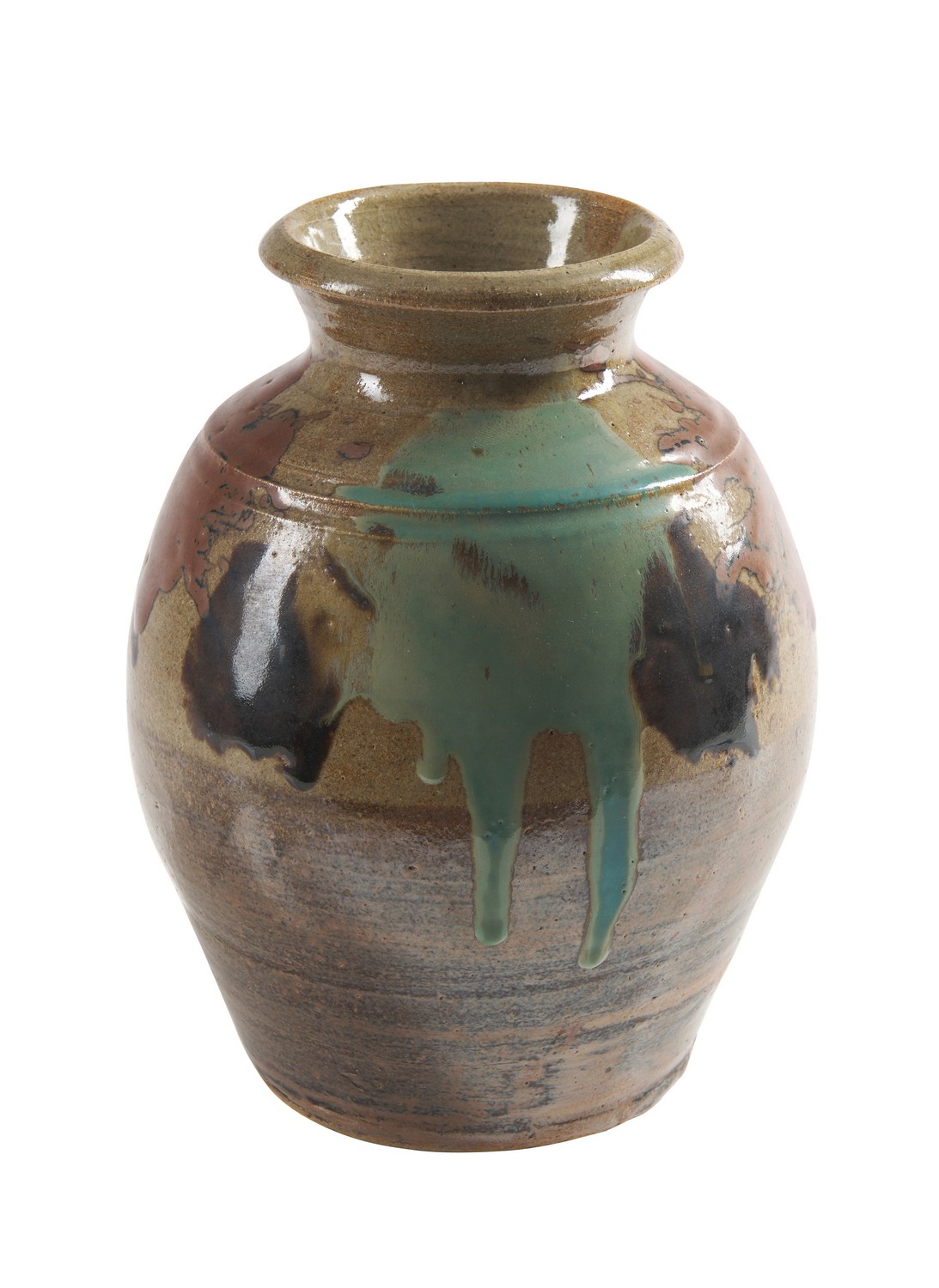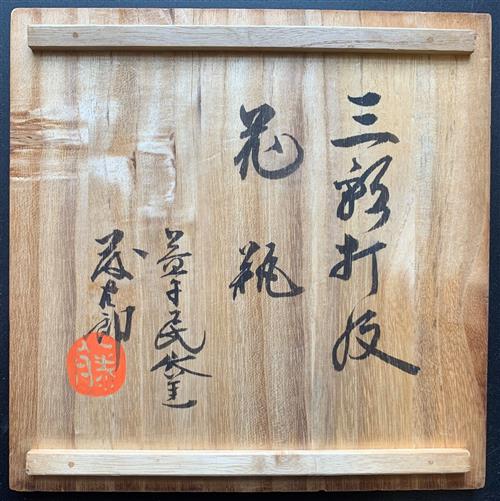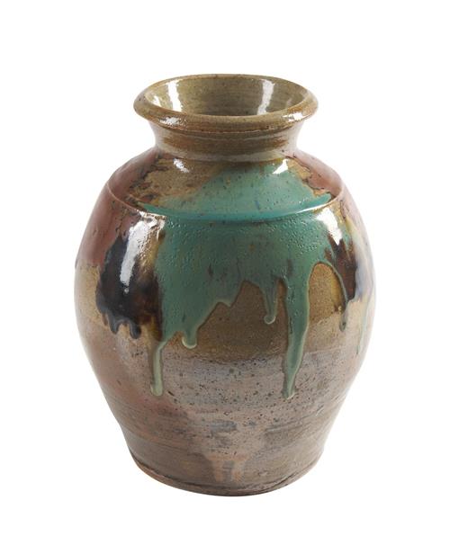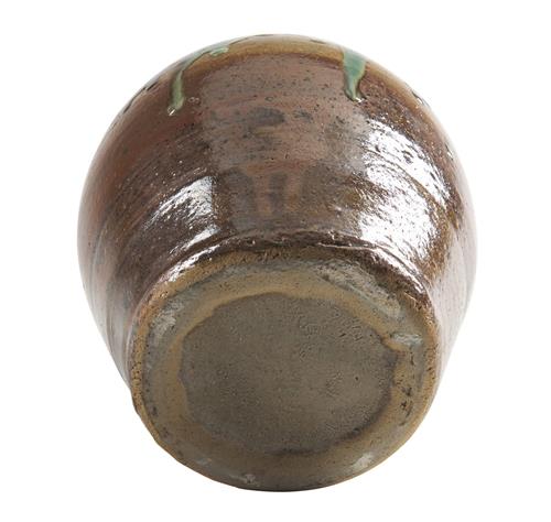 The baluster form stoneware tsubo with large splashes to the sides of green and kakiyu (persimmon) glazes. Together with tomobako (original inscribed box).