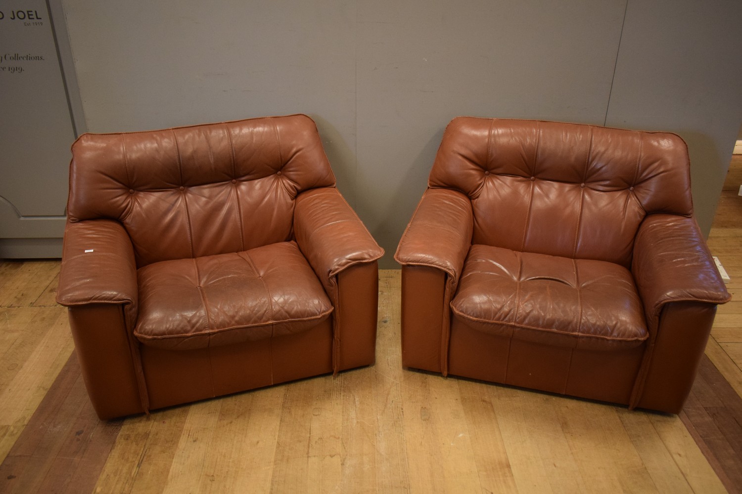 A PAIR OF TESSA ARMCHAIRS IN BROWN LEATHER BY FRED LOWEN