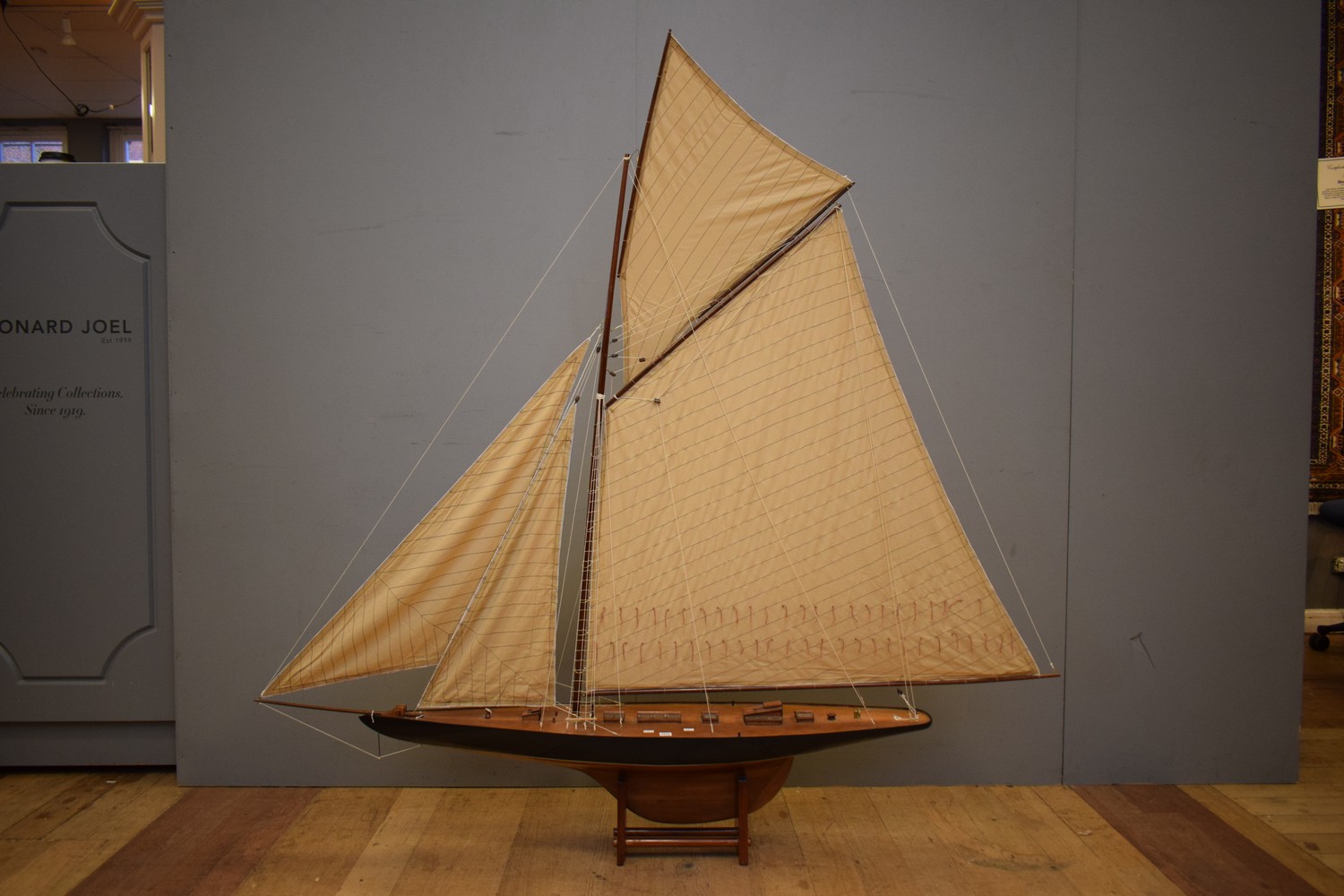 A WOODEN SAILBOAT REPLICA, 'COLUMBIA', DEFENDER OF THE TENTH AMERICAS CUP RACE IN 1899 AGAINST BRITISH CHALLENGER SHAMROCK (172H X 174W X 21D)