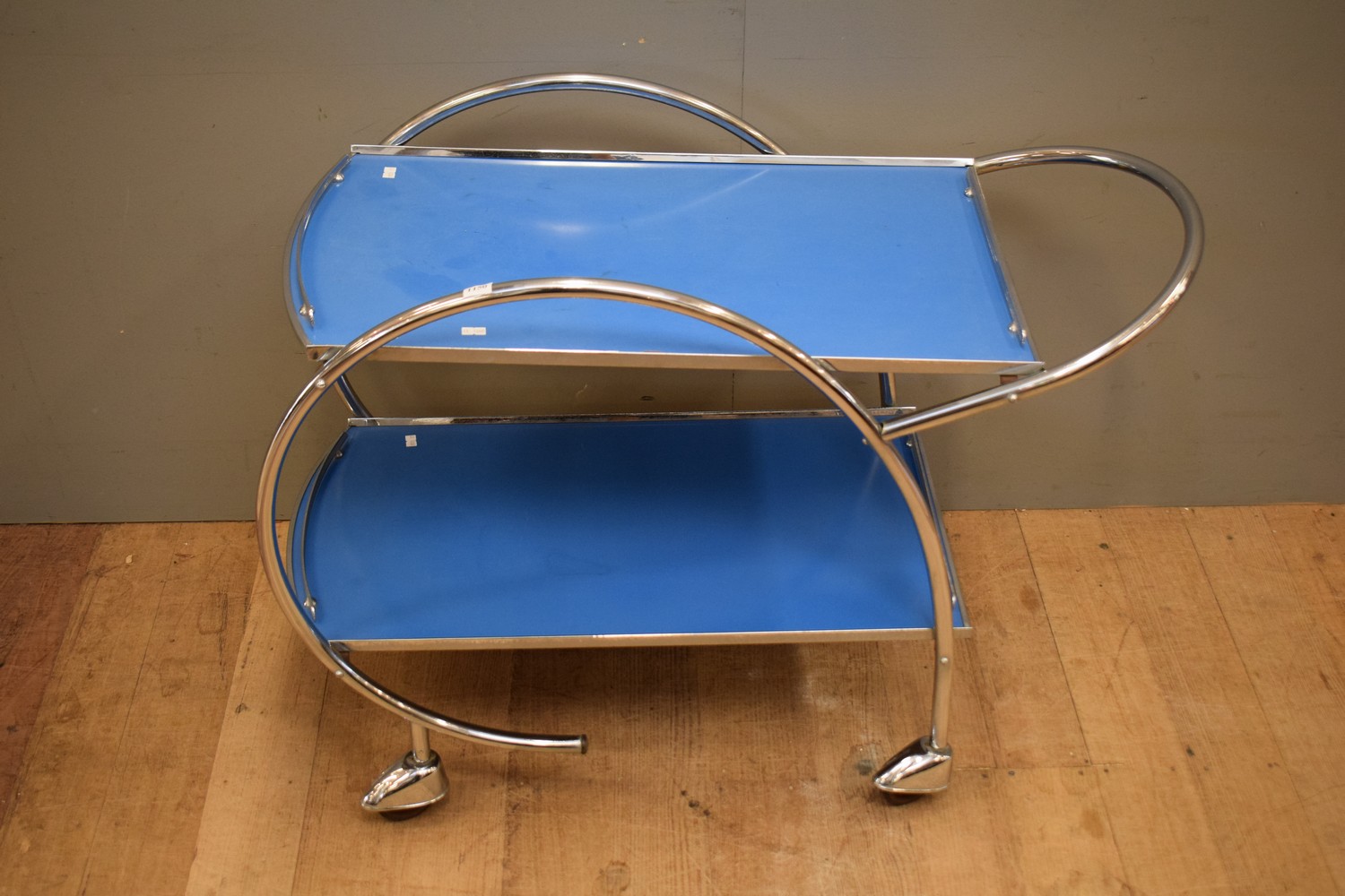 A CHROME FEATURED BLUE DRINKS TROLLEY