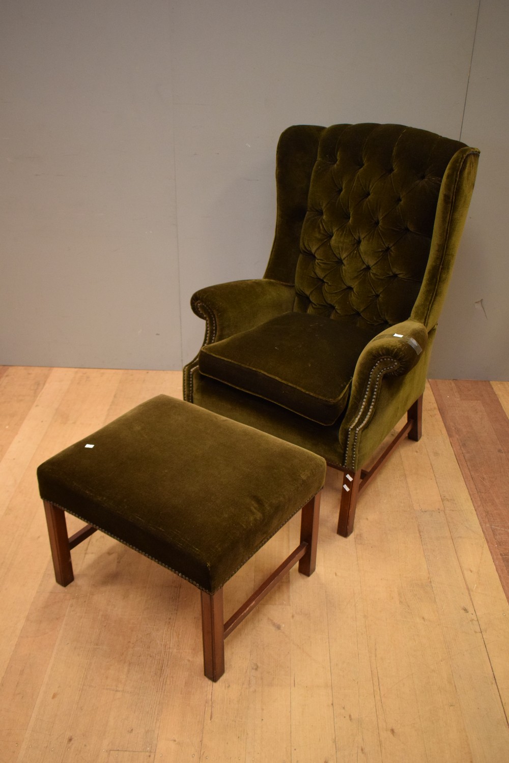 AN UPHOLSTERED WINGBACK BUTTONBACK ARMCHAIR AND OTTOMAN